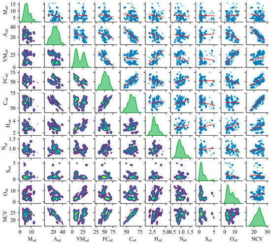 In Figure 3, the closer the Pearson correlation coefficient is to 1, the stronger the linear correlation between the two items. When the correlation coefficient is positive, the two are positively correlated; when the correlation coefficient is negative, the two are negatively correlated [34]. Based on this, it can be observed that among the items of coal’s proximate analysis and ultimate analysis, only the correlation coefficients between Aad and NCV and between Cad and NCV are greater than 0.85, indicating a certain degree of linear correlation, while the correlation coefficients between the remaining items and NCV are all below 0.60, indicating weak linear correlation. Therefore, when predicting calorific value based on proximate analysis and ultimate analysis, nonlinear modeling methods should be prioritized.