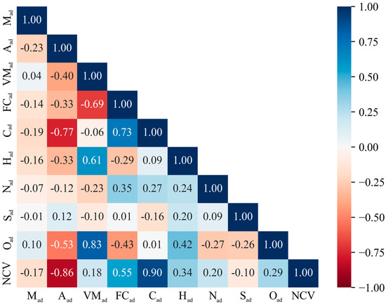 To further investigate the linear correlation between various coal quality indexes and calorific value, Pearson correlation analysis was employed to quantitatively describe the linear correlation between the parameters [33]. The Pearson correlation matrix was calculated based on the coal quality data in Table 2, as shown in Figure 3.