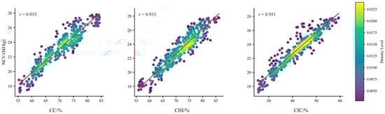 To validate the linear enhancement effect of the above three derived indicators, the Pearson correlation coefficients r between these three derived indicators and NCV were calculated, as shown in Figure 4. The results in Figure 4 indicate that the Pearson correlation coefficients r between CC, CHI, CIC, and NCV are 0.935, 0.935, and 0.951, respectively. This value significantly exceeds the correlation between any individual original indicator and NCV (the highest previously being that of ash content (Aad) and carbon content (Cad), with correlation coefficients only slightly above 0.85). This indicates that constructing derived indicators through physical–chemical mechanisms can effectively extract latent linear features, providing an optimal set of input variables for subsequent linear-nonlinear mixed modeling.