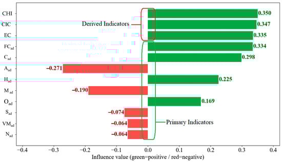 By combining the MIV algorithm with SVR, the coal original items and derived indicators in the calorific value prediction process were screened, and the MIVs of different characteristic variables and their influence weights on calorific value were calculated. The results are shown in Figure 6.