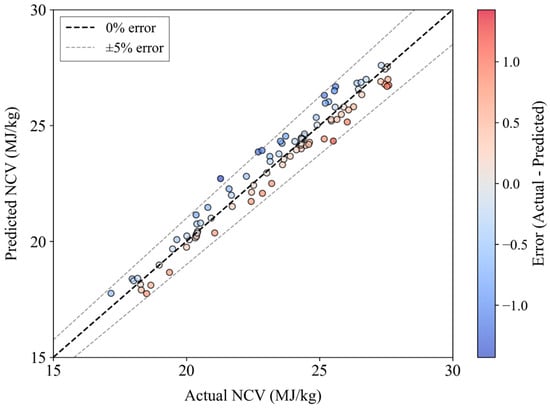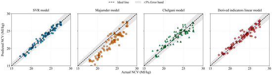 Following a long line of research on coal calorific value prediction, Mason and Given et al. [5,6] in the 1980s established a multivariate linear regression model based on proximate and ultimate analysis results. Kucukbayrak et al. [7] utilized proximate analysis data from 24 sets of Turkish brown coal, and employed the least squares regression method to construct a regionalized calorific value prediction model. The average relative error between the calculated value and the measured value is 3.78% to 7.56%. Majumder et al. [8] established a calorific value prediction model using multiple linear regression based on 250 sets of Indian coal proximate analysis data, with an average relative error of 1.49%. Chelgani et al. [9] established a multiple linear prediction model for calorific value based on proximate analysis and ultimate analysis using linear regression based on 83 sets of Afghan coal quality data. Akhtar [10] established a multiple linear regression model to predict the calorific value of high-ash brown coal in Pakistan based on data from four regions, including Khushab. The model was validated through variance analysis and error testing, which indicated that the three-variable model (volatile matter, ash content, and fixed carbon) and the two-variable model (ash content/fixed carbon) yielded the lowest error. Mesroghli et al. [11] used data from 4540 coal samples from the United States to regression and artificial neural networks (ANN) to predict calorific value. The regression results showed the best prediction, with minimum and maximum errors of −23.6% and +11.9%, respectively. Although the above linear modeling methods achieved satisfactory prediction results, they are mostly limited to a single coal type in a specific mining area or region, with restricted application scope. Particularly, when faced with special situations such as the calorific value calibration of port coal from complex sources, the limitations of such prediction methods become even more pronounced.