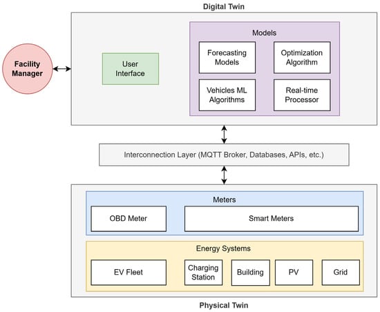 This methodology was applied in the framework of the DigiBUILD project [25]. Precisely, a DT was developed to optimize the management of the microgrid associated with Emotion S.r.l. (Perugia, Italy), an Italian company operating in the field of EV charging stations. This case study focuses on one of the company’s buildings, which is equipped with 50 kWp PV panels and four EV charging points, each rated at 11 kW. Through the use of optimization algorithms, charging strategies will be provided via the DT for the company’s fleet of EVs. The algorithm’s input will include forecasts of building energy consumption, PV production, and user needs. Moreover, the DT can control the charging of connected EVs in real-time, leveraging available PV power to reduce energy costs. This will contribute not only to energy efficiency but also to grid stability. Finally, the DT dashboard not only displays historical and real-time information but also serves as a decision support system (DSS), suggesting manual actions such as setting the setpoint temperature for HVAC and advising on connecting or disconnecting vehicles. An overview of the DT is presented in Figure 1, which includes a high-level scenario diagram. The physical twin encompasses all the energy systems involved in the microgrid, as well as the metering systems. An interconnection layer regulates the input and output between the digital and physical twins, ensuring the update of the models and their impact on the physical twin through APIs. Real-time synchronization between the physical system and the digital twin is achieved via Apache Kafka topics, which stream sensors and operational data directly to the DT in real time. Historical and semantic information is stored and accessed via a data warehouse and an intelligent querying mechanism [26]. Finally, the facility manager interacts with the digital twin to monitor the system and optimize EV charging thanks to all the models included in the digital twin back-end. The presented approach meets the most up-to-date focus in scientific literature data and adaptive control for the optimal use of energy in facilities hosting RESs and EV fleets [27].