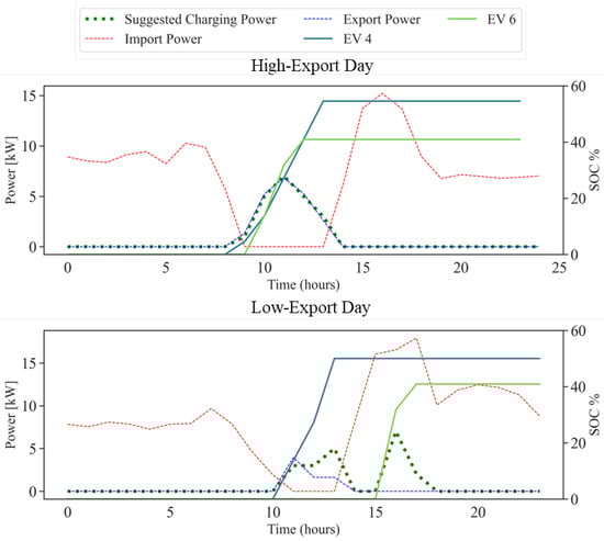 In scenarios where the export exceeds the plug’s power capacity, the algorithm recommends which vehicle to charge first based on the vehicle with the highest EV capacity, as defined in Equation (8).