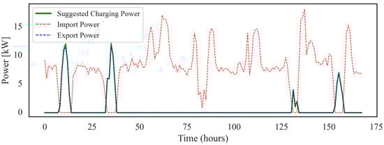 Through the DT dashboard, the user can select one of the suggested strategies or activate the “Automatic Control” mode, which engages the real-time processor module. The output of each strategy specifies the optimal time to connect the EV for charging, as well as the power modulation behavior for each charging port. The system then regulates the charging power at each port, ensuring the predicted balance between energy import and export. In the “Automatic Control” mode, if the real-time data processor detects an imbalance in grid power import or export, the algorithm automatically adjusts the charging power or provides suggestions to address the issue, functioning as a DSS.