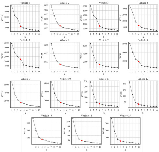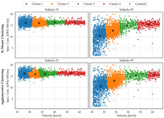 This approach would guarantee the discovery of an alternative solution, rather than relying on average or constructor-declared consumption. In particular, while the supervised approach requires choosing input features before model training, necessitating multiple feature tests based on correlations encountered, the unsupervised approach can be used to understand new relationships through cluster analysis. Additionally, in cases of low correlation in data, clustering techniques can offer an opportunity to find simpler relationships that approximate real behavior. In particular, unsupervised clustering techniques, including K-Means, GMM, and agglomerative clustering, were employed using the SciKit Learn [38] Python library. Before applying clustering techniques, the data was standardized, and a weight of 5 times higher was applied to velocity. This weight was imposed to better differentiate consumption based on velocity, rather than consumption, as in the DT, the user would select an average velocity to assess the vehicle consumption. The elbow method was applied to calculate the best number of clusters suitable for all vehicles. Finally, the quality of the clusters was subsequently evaluated using the Silhouette Score and the Davies–Bouldin index. The centroids of each cluster are then used in the DT to calculate the SoC desired by the user, given the distance to be traveled and the average velocity of the itinerary.