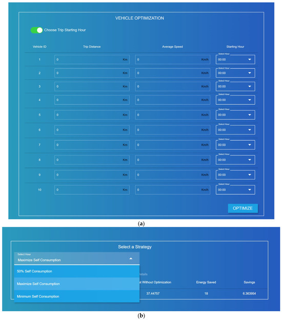 Dashboard of the smart grid digital twin: vehicle selection page (a) and strategy selection page (b).