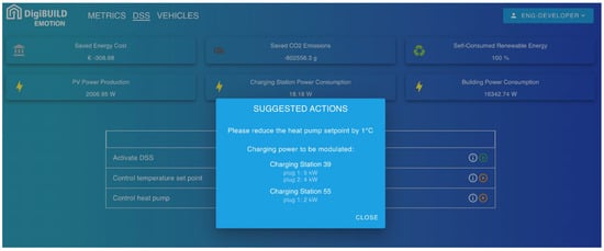If the plug capacity is insufficient, the system recommends disconnecting a vehicle after verifying whether its SoC has already reached the user-defined target. In addition, it may suggest adjusting the heat pump setpoint temperature. Specifically, during energy export, the DSS advises increasing the setpoint in winter or lowering it in summer. Conversely, during energy import, the algorithm suggests decreasing the setpoint in winter or raising it in summer, while ensuring compliance with minimum comfort requirements.