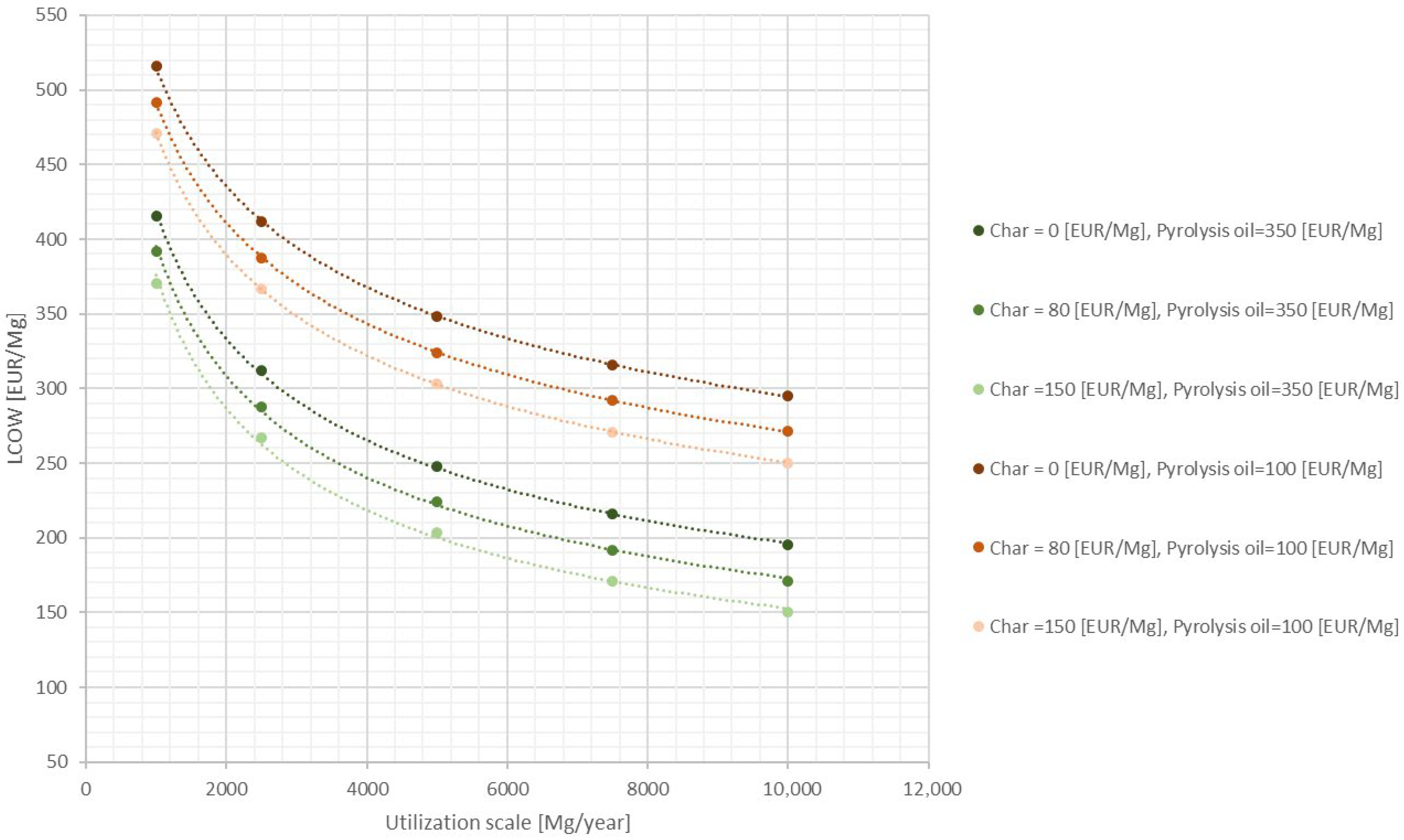 - optimistic scenario: EUR 150/Mg, as a product with properties similar to biochar or low-grade industrial activated carbon.