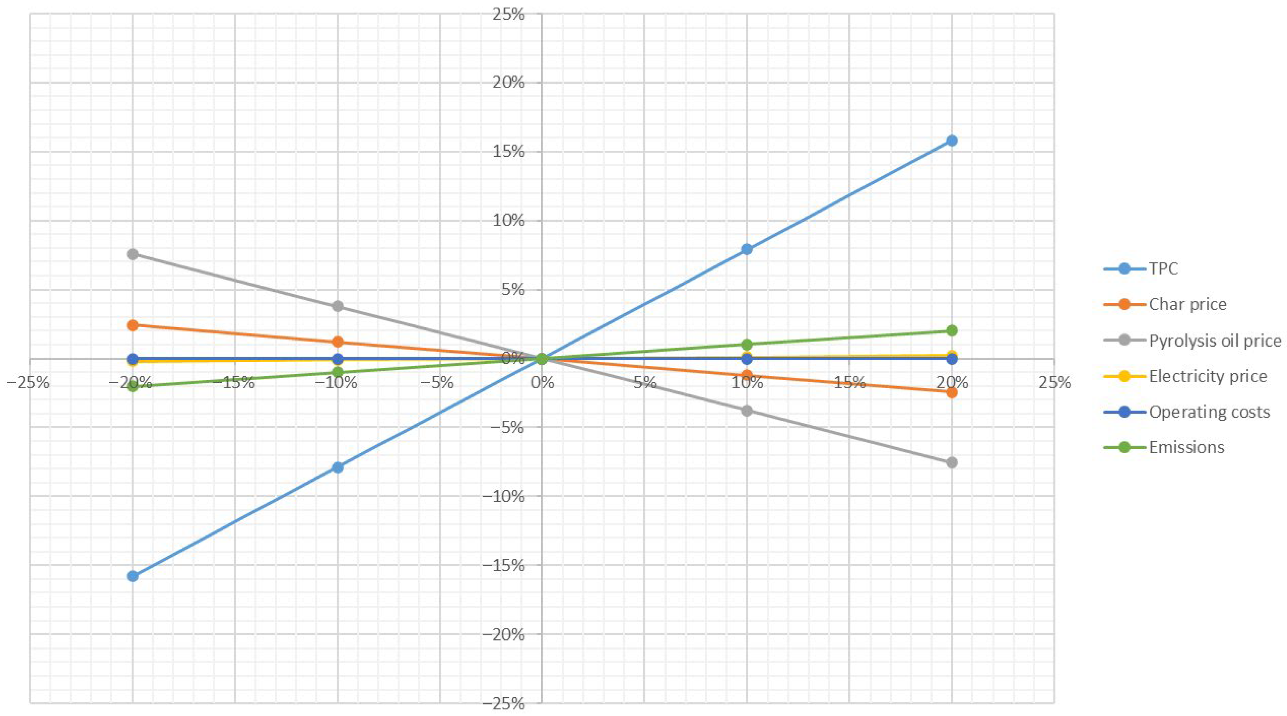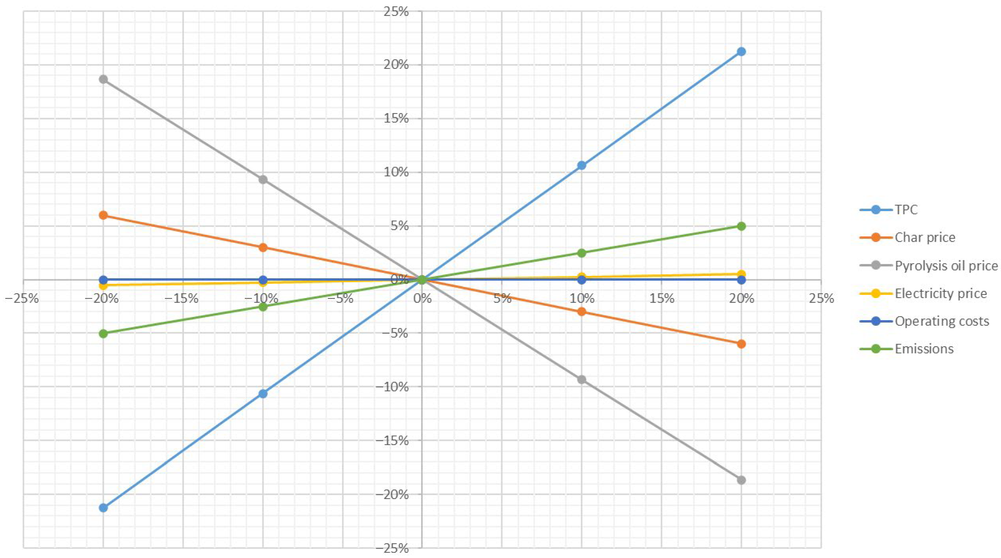 - Pyrolysis oil value—almost symmetrical impact, within ±20%,