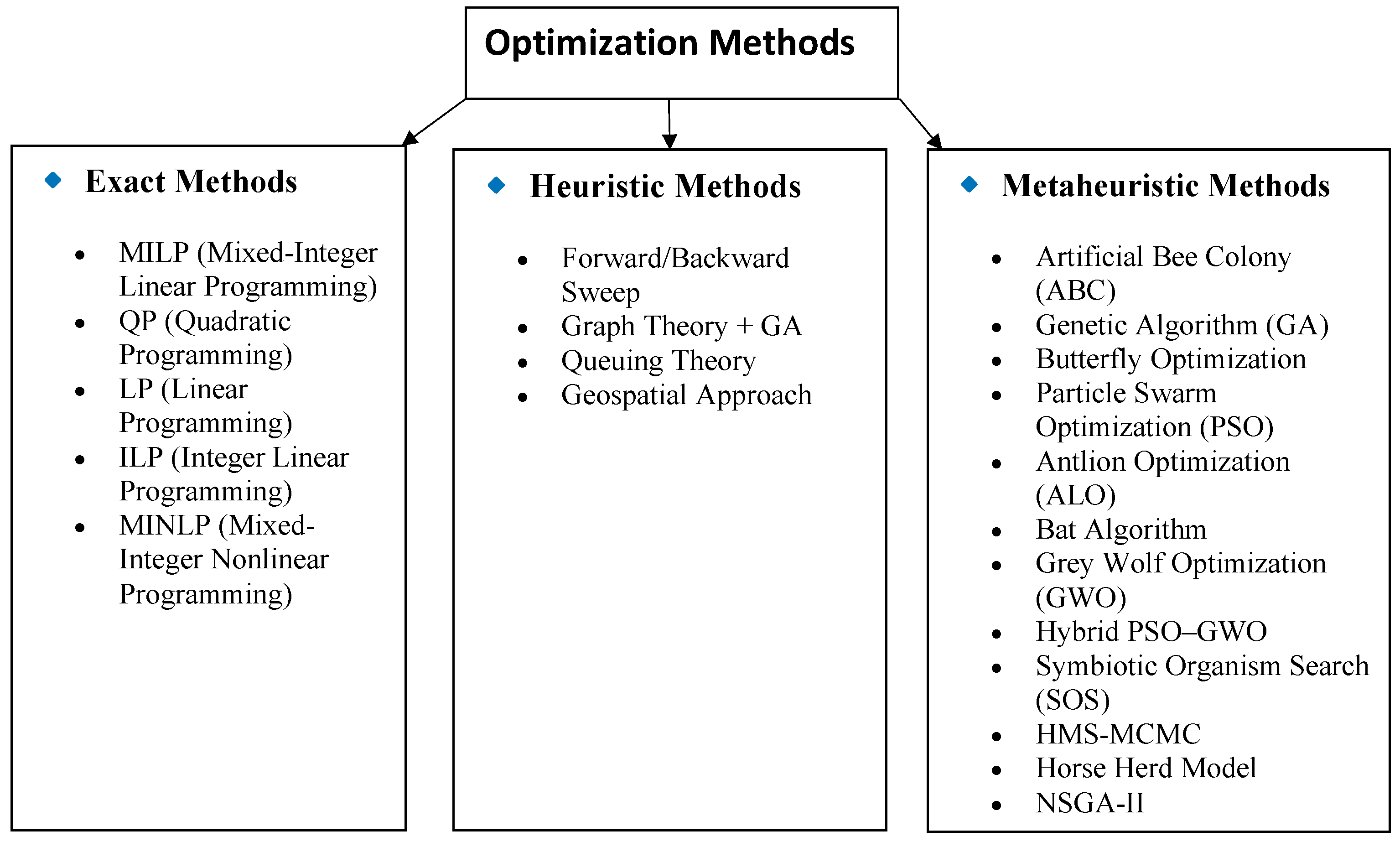 | 2020–2021 | Increasing use of heuristics and metaheuristics alongside some exact approaches. Metaheuristics commonly used: GA, PSO; attention to multi-objective formulations and reliability indices. | [1,5,6,9,15] |