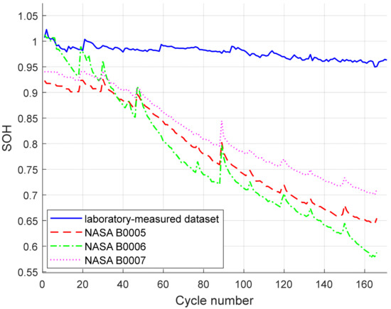 The NASA lithium-ion battery dataset was collected at room temperature (25 °C). Each cell was first charged with a constant current of 1.5 A until the voltage reached 4.2 V, followed by a constant-voltage charging mode until the current decreased to 20 mA. Subsequently, the cells were discharged at a constant current of 2 A with cut-off voltages of 2.7 V, 2.5 V, and 2.2 V, corresponding to the cycling data of batteries B0005, B0006, and B0007, respectively. The experiments were terminated once the end-of-life (EOL) criterion was reached, defined as a 30% reduction in rated capacity from 2 Ah to 1.4 Ah, yielding a total of 168 cycles.
