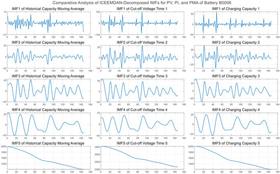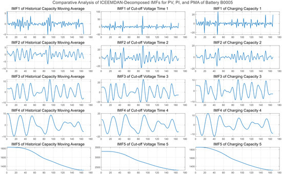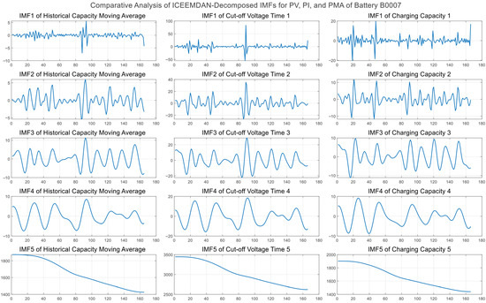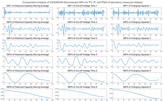 In the ICEEMDAN decomposition, the noise standard deviation Nstd was set to 0.2 to balance decomposition accuracy, noise resistance, and computational efficiency, ensuring effective mode separation while avoiding excessive noise residues. The ensemble size was chosen as NR = 100, which provides stable decomposition results while significantly reducing computational cost, making it suitable for large-scale battery cycling data. The maximum number of iterations was set to MaxIter = 5000 to guarantee full convergence of IMFs in complex nonstationary signals. In addition, an improved noise-increment strategy was enabled with SNRFlag = 1, which helps further enhance IMF purity and reduce reconstruction errors. The decomposition results of the three input features across the four datasets are shown in Figure 4, Figure 5, Figure 6 and Figure 7.