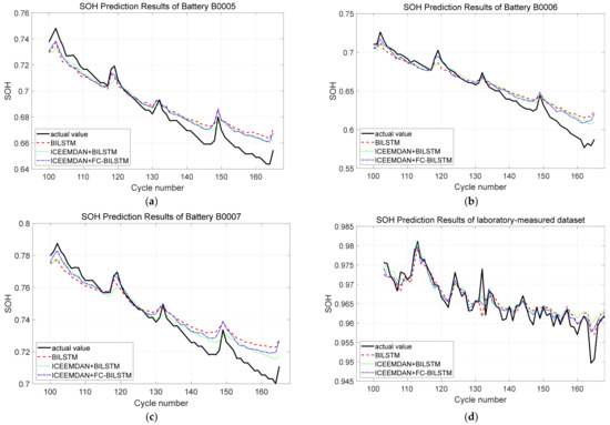SOH Prediction Results of (a) B0005, (b) B0006, (c) B0007, and (d) laboratory-measured dataset under Different Methods.