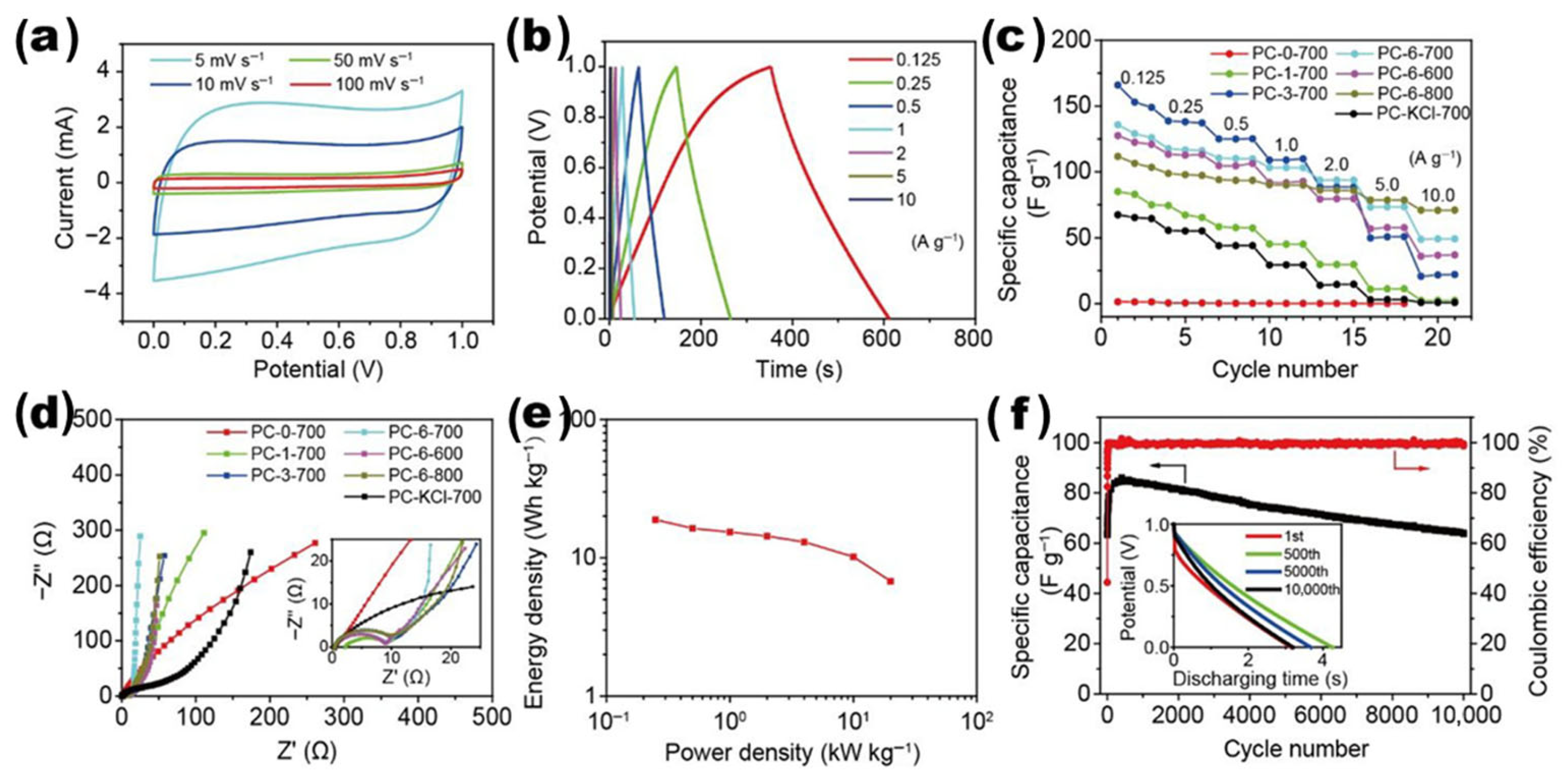 | N,O-codoped agar porous carbon (APC) | Symmetric supercapacitor | 272 (at 0.5 A g−1) | 20.4 | 449 | 100%/10,000 | [234] |