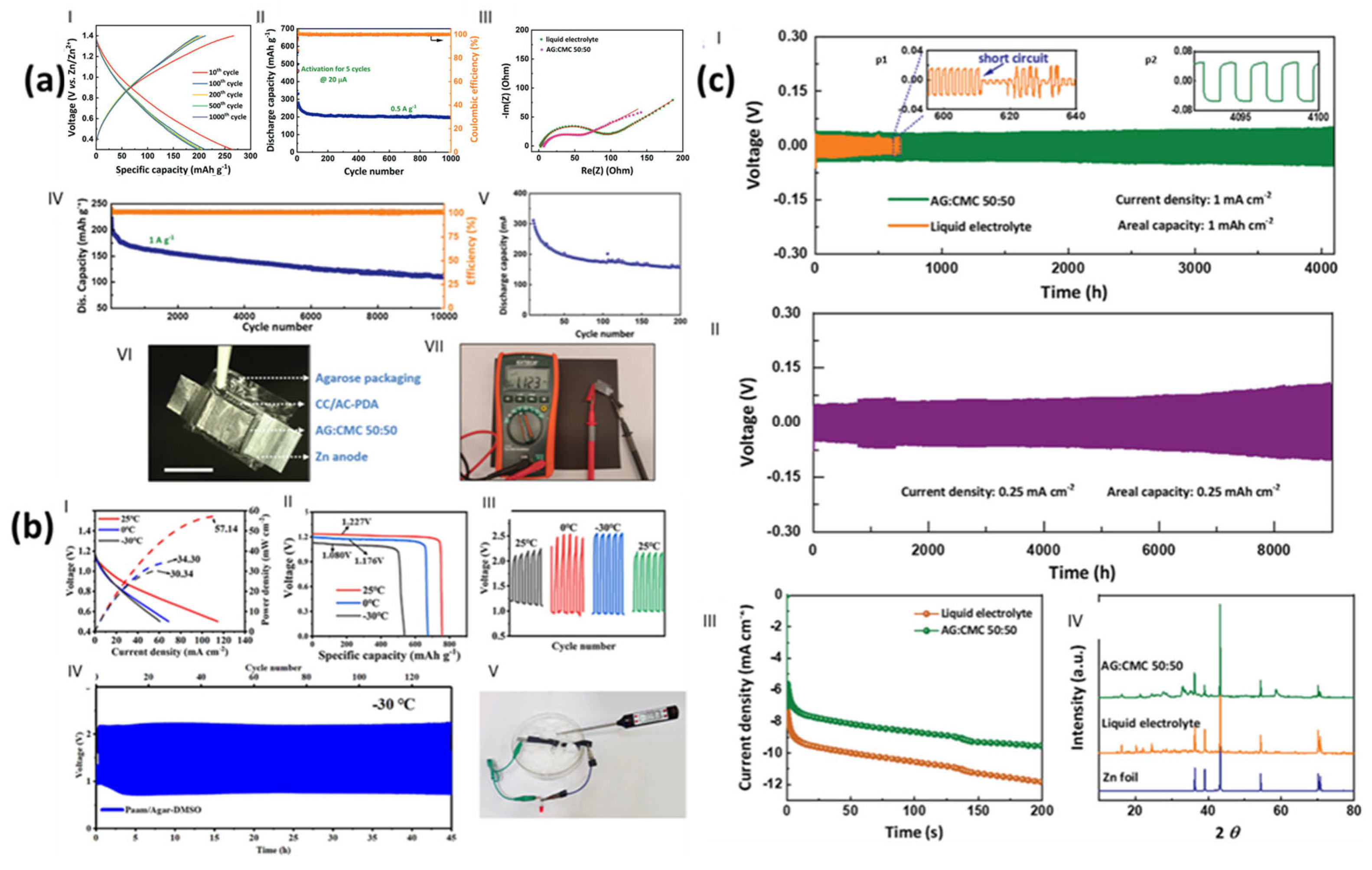 | Agar–polyacrylamide hydrogel polymer electrolyte | Electrolyte for ion transport and mechanical flexibility | Flexible quasi-solid-state aqueous lithium–zinc hybrid ion batteries | Ionic conductivity: high; electrochemical stability: broad window; ion migration number: notable; symmetric cell cycling stability: 350 h at 1 mA/cm2; full battery cycle life: retains 80.5% capacity after 500 cycles at 1 C | [264] |