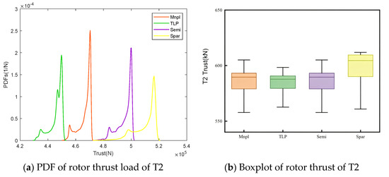 Figure 17b,d further quantify the statistical distributions of rotor thrust and torque using box plots for the downstream turbines. The downstream turbine associated with the Spar platform (yellow) exhibits the highest median thrust, approaching 610 kN, along with the widest interquartile range and a maximum value nearing 660 kN. Similarly, the rotor torque boxplot shows that the Spar case features the highest median and peak values—reaching nearly 2800 kN·m—combined with the broadest distribution range. These metrics indicate the most pronounced load fluctuations and a high frequency of extreme values, consistent with the multimodal characteristics observed in its PDF distributions. This behavior is strongly attributed to the Spar platform’s pronounced coupled pitch and heave responses, which generate unsteady vertical and lateral wake deflections, resulting in periodic variations in rotor loading. The Semi platform (purple) yields a median thrust of approximately 590 kN, with a relatively compact interquartile range, indicating a moderate overall load level and reduced variability. This suggests that the platform exhibits milder motion dynamics, resulting in more controllable wake disturbances. In terms of rotor torque, the Semi platform occupies an intermediate position among the four configurations, with a median value ranging between 2600–2650 kN·m and a moderate spread. This reflects a well-balanced aerodynamic and structural response. The TLP platform (green) exhibits a median rotor thrust of approximately 545 kN, which is slightly lower than that of the Semi platform, and the range between its maximum and minimum values spans nearly 100 kN. The Mnpl platform (orange) displays the smallest interquartile range and a relatively low median thrust of approximately 555 kN in the box plots, indicating that the downstream turbine operates in the most stable inflow conditions. The thrust distribution is highly concentrated, and the load input is uniform, making it the most favorable configuration for load control. Additionally, the Mnpl platform shows the lowest median rotor torque, with the narrowest box and the smallest span between maximum and minimum values, further confirming that its torque input is the most consistent and its aerodynamic environment the most stable. In summary, the Spar platform exhibits the most intense platform-induced motions, resulting in large fluctuations and frequent extremes in downstream turbine thrust loads, thereby significantly increasing structural fatigue risks. In particular, its high-amplitude pitch motion induces vertical (Z-direction) wake deflections, generating vertically non-uniform inflow conditions that exacerbate dynamic loading. By contrast, the TLP and Mnpl platforms maintain more stable responses, leading to safer and more consistent operating conditions across the wind farm. The Semi-submersible platform offers a balanced trade-off, with moderate thrust levels and manageable variability, achieving a compromise between energy capture and load stability. Overall, the Spar platform’s complex motion characteristics cause strong wake disturbances, exposing downstream rotors to multimodal and high-amplitude torque fluctuations, making it the most critical in terms of fatigue-driven load accumulation. The Semi platform, by inducing moderate perturbations, offers a more favorable balance between structural resilience and aerodynamic performance. These findings underscore that the platform’s degrees of freedom and its wake disturbance dynamics are key determinants of downstream turbine loading behavior, and should pay attention to array layout planning and structural fatigue life design for floating offshore wind farms.