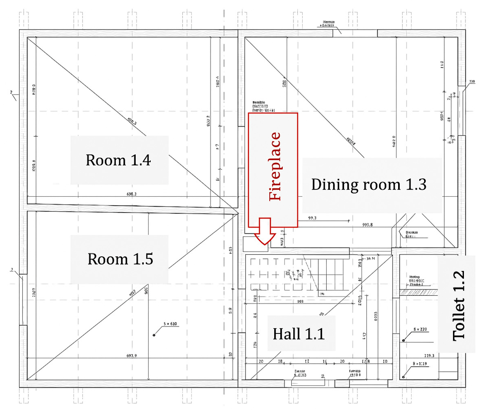 - D1—Detail of the joint of two outer walls in room 1.3, the so-called exterior corner.