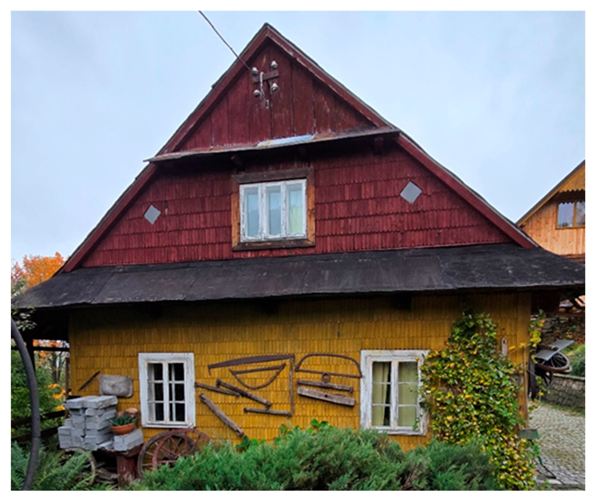 - Agnieszka, M. Drewniana Chałupa Wiślańskiego Górala na Wybranych Przykładach; Gont: Katowice, Poland, 2017; pp. 87–106. [Google Scholar]