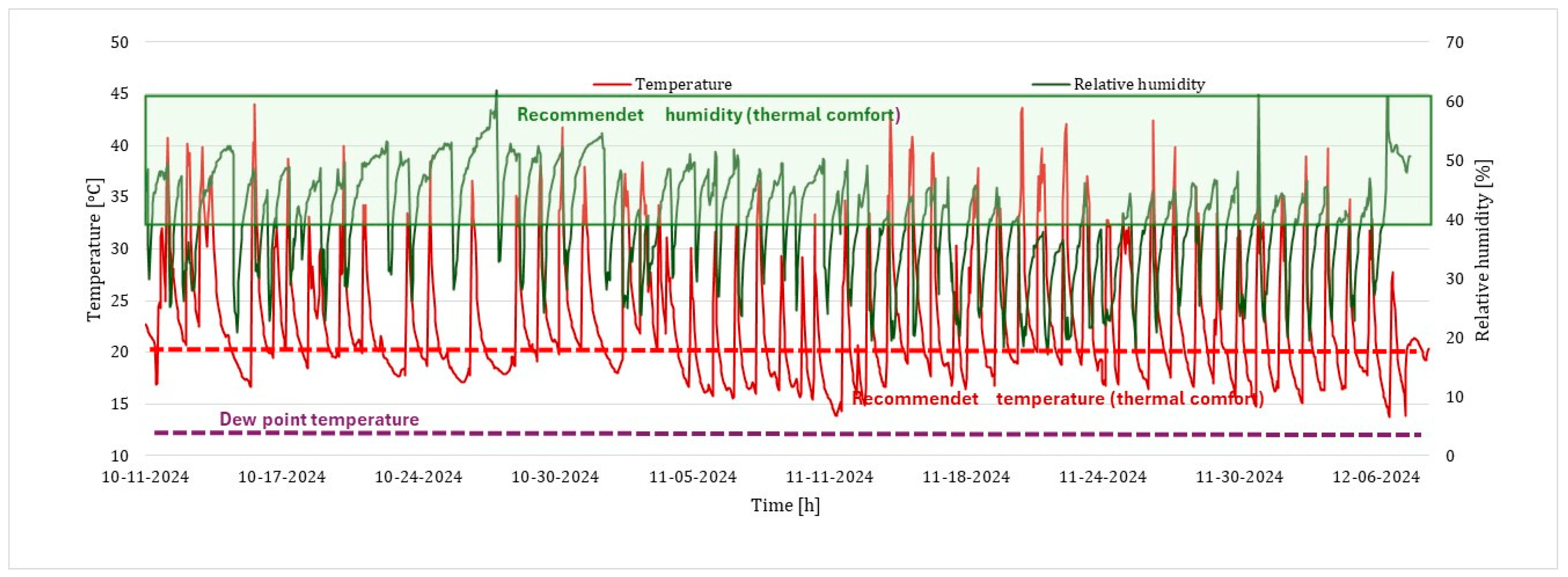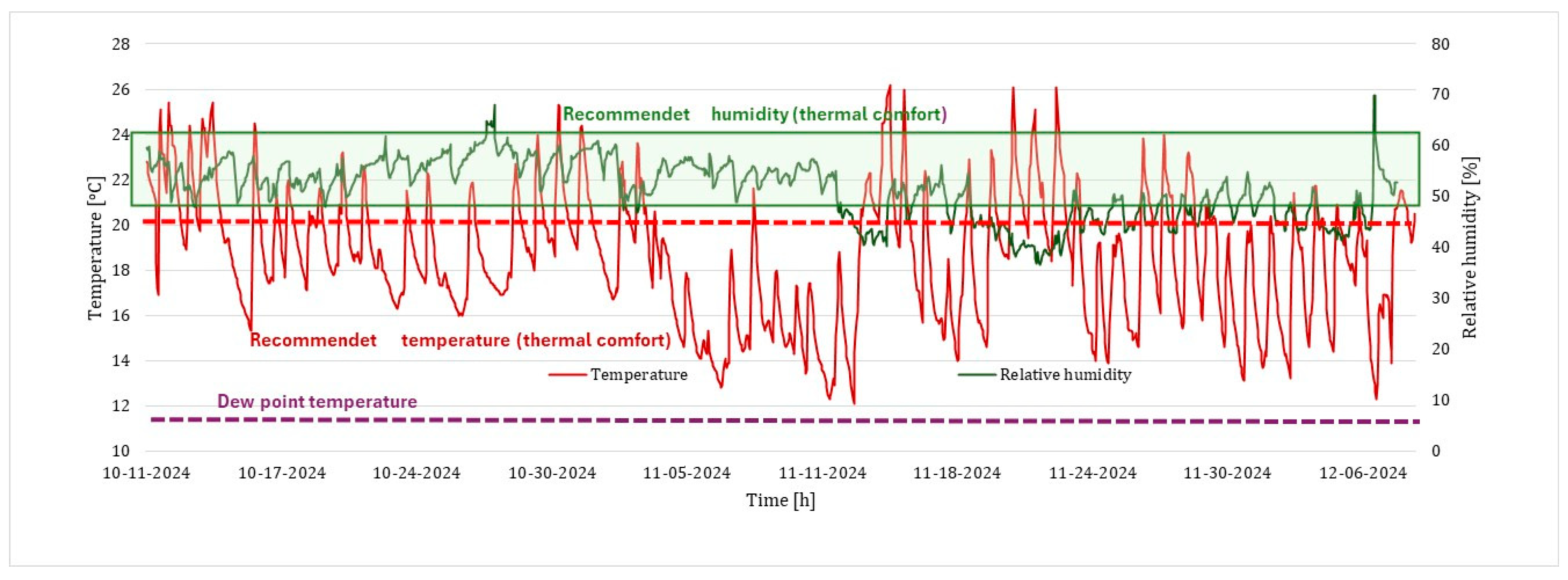 - The proposed thermal modernization measures, involving internal insulation of the building envelope, did not result in an increase in the moisture content of the insulation system components during the monitoring period.