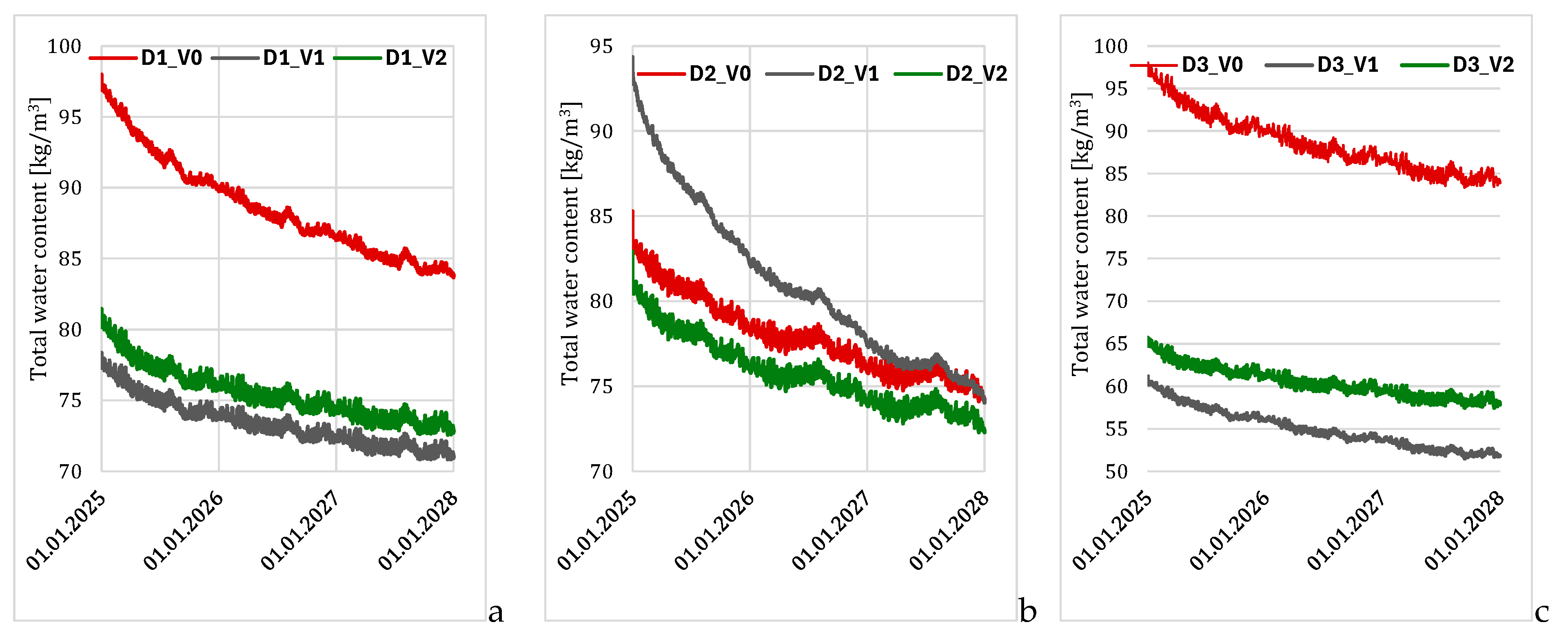 - For the D2 model, differences in total moisture content for individual variants (V0, V1, V2) were observed at the beginning of the calculation period. The highest initial moisture content was found in variant V1, upgraded with wood wool, for which the initial moisture content was higher by around 10–12 [kg/m3] than V0 and V2 variants. At the end of the 3-year calculation period the envelope components dried up to virtually the same levels as in other variants;