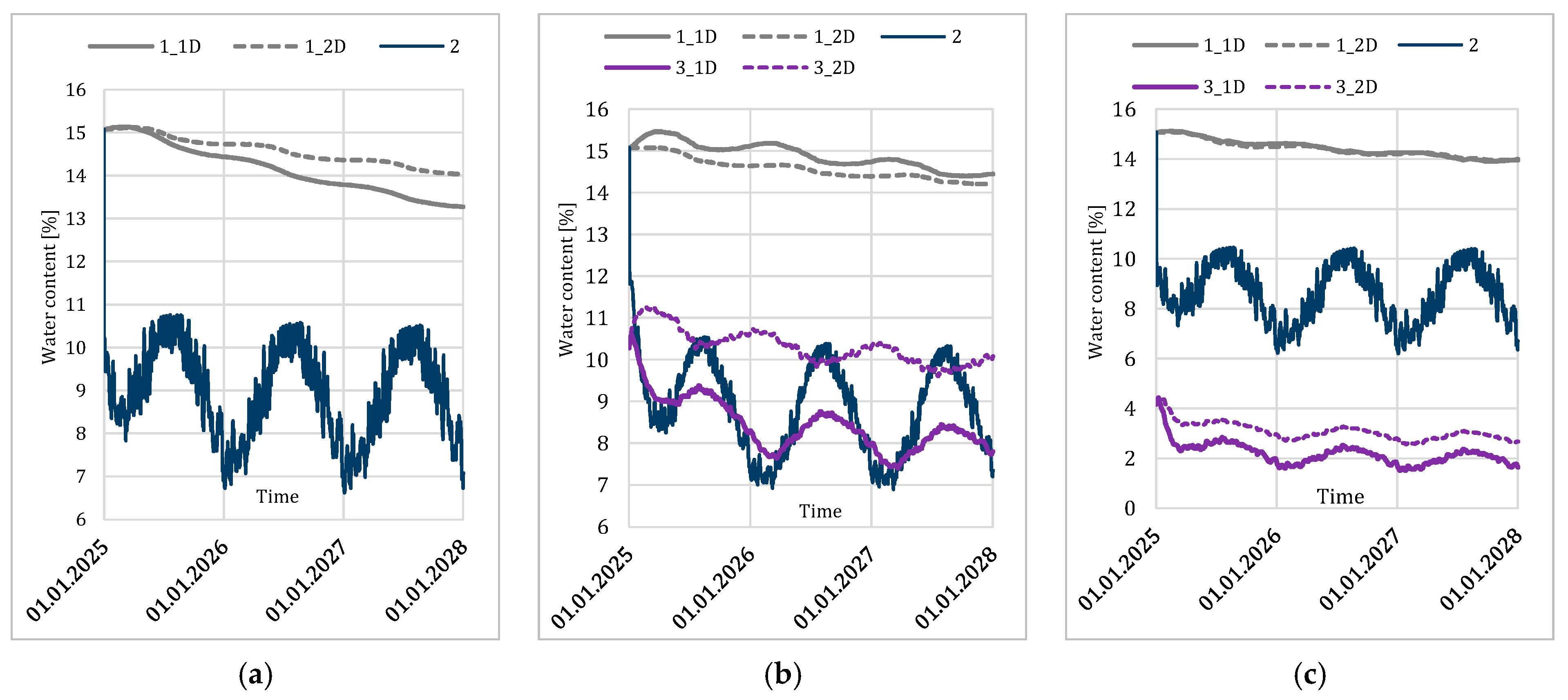 - For the D1 model, adding thermal insulation of walls—regardless of the insulation material type—significantly reduced the moisture content in the entire system. The total moisture content in the upgraded systems was lower by at least 10 [kg/m3] than the current state at the and of the analyzed period.
