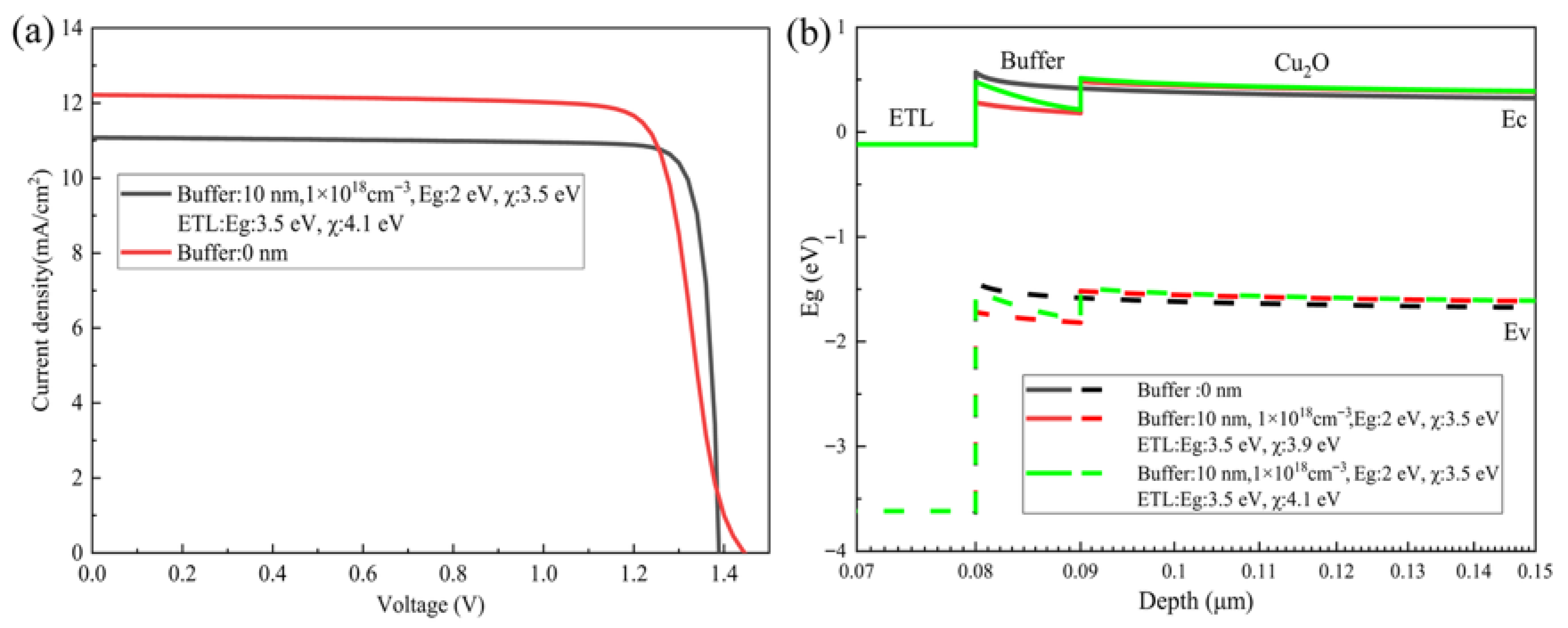 Toshiba’s latest 10.5% Cu2O solar cell employs the stack ZnO(Al)/n-buffer/p-Cu2O/ZnO(Al)/glass (10 × 3 mm2, AM1.5G, open-circuit voltage (Voc) = 0.86 V, short-circuit current density (Jsc) = 15.8 mA cm−2, fill factor (FF) = 71.2%). In line with this architecture, the present simulations initialized the structure with ZnO(Al) as the electron-transport layer (ETL) and Cu2O(P+) as the hole-transport layer (HTL). In the absence of a buffer, the ZnO(Al)/Cu2O/Cu2O(P+) device exhibits an S-shaped J–V curve (Figure 2a) because the large CBM and VBM offset between ZnO(Al) and Cu2O creates a substantial electron barrier that impedes carrier transport. Inserting a 10 nm buffer lowers this barrier; however, the thicker buffer introduces significant parasitic absorption, reducing the Jsc. Figure 2b illustrates the band alignment before and after buffer insertion. By tuning the electron affinity of the ETL, the CBM and VBM positions can be adjusted to further minimize the band offset and barrier height. The simulations fixed the Cu2O absorber at 10 μm thickness with a doping concentration of 1 × 1015 cm−3, the ETL at 80 nm with 1 × 1020 cm−3, and the buffer at 2 nm with 1 × 1020 cm−3, while systematically varying the Eg and electron affinity of the ETL and buffer to investigate their influence on band alignment and solar-cell performance, thereby identifying more suitable ETL, buffer, and HTL layers based on the optimal Eg and electron affinity values.