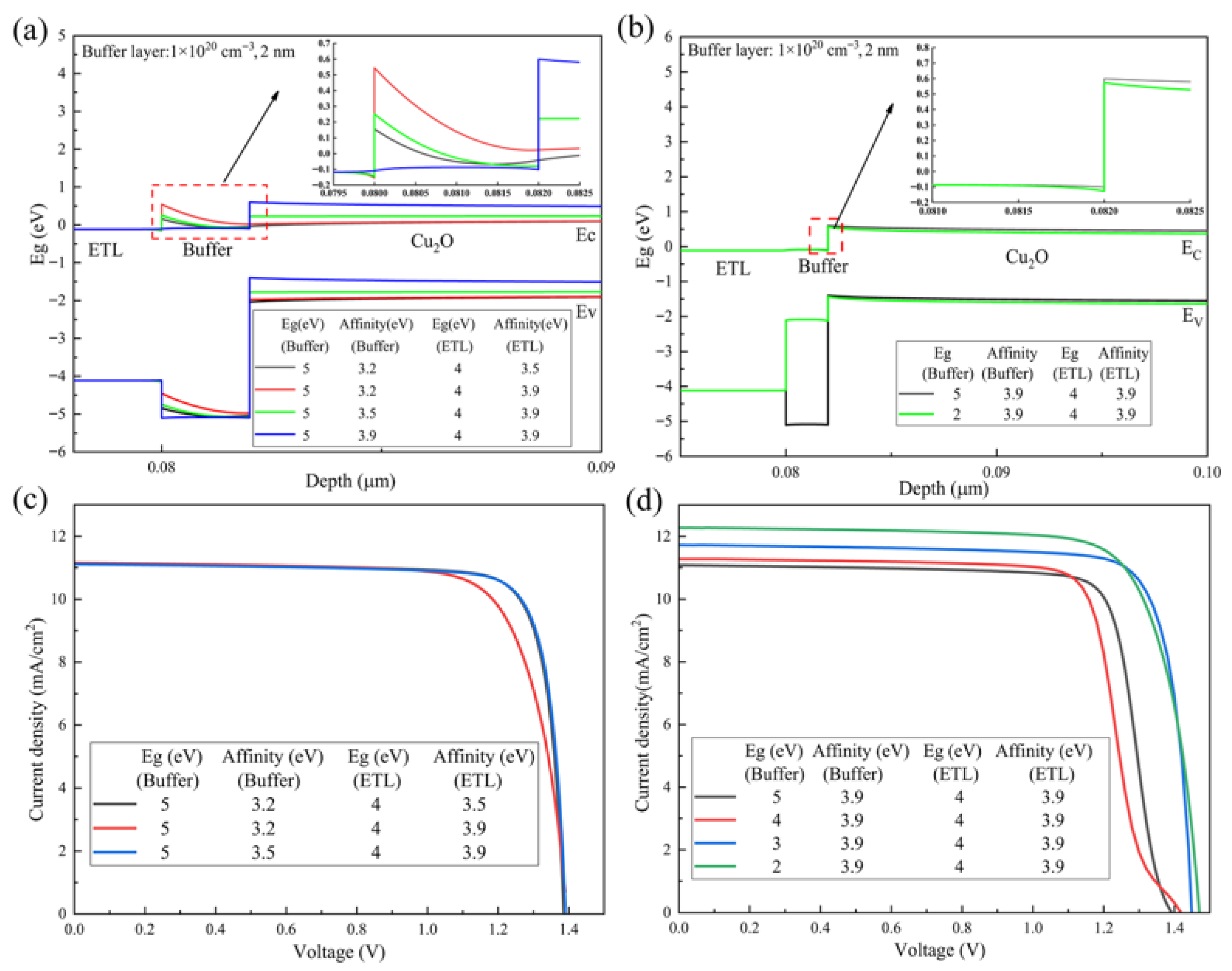 Figure 3. (a,b) Band diagrams of buffer layers with different bandgap (Eg) and electron affinity (χ) values at a doping concentration of 1 × 1020 cm−3 (simulation parameters: ETL: 80 nm, 1 × 1020 cm−3; Cu2O: 10 μm, 1 × 1015 cm−3, Eg: 2 eV, χ: 3.2 eV; buffer: 2 nm, 1 × 1020 cm−3; HTL: 200 nm, 1 × 1020 cm−3, Eg: 2 eV, χ: 3.2 eV). (c,d) Current density–voltage (J–V) characteristics of the Cu2O solar cells with varying bandgap and electron affinity combinations.