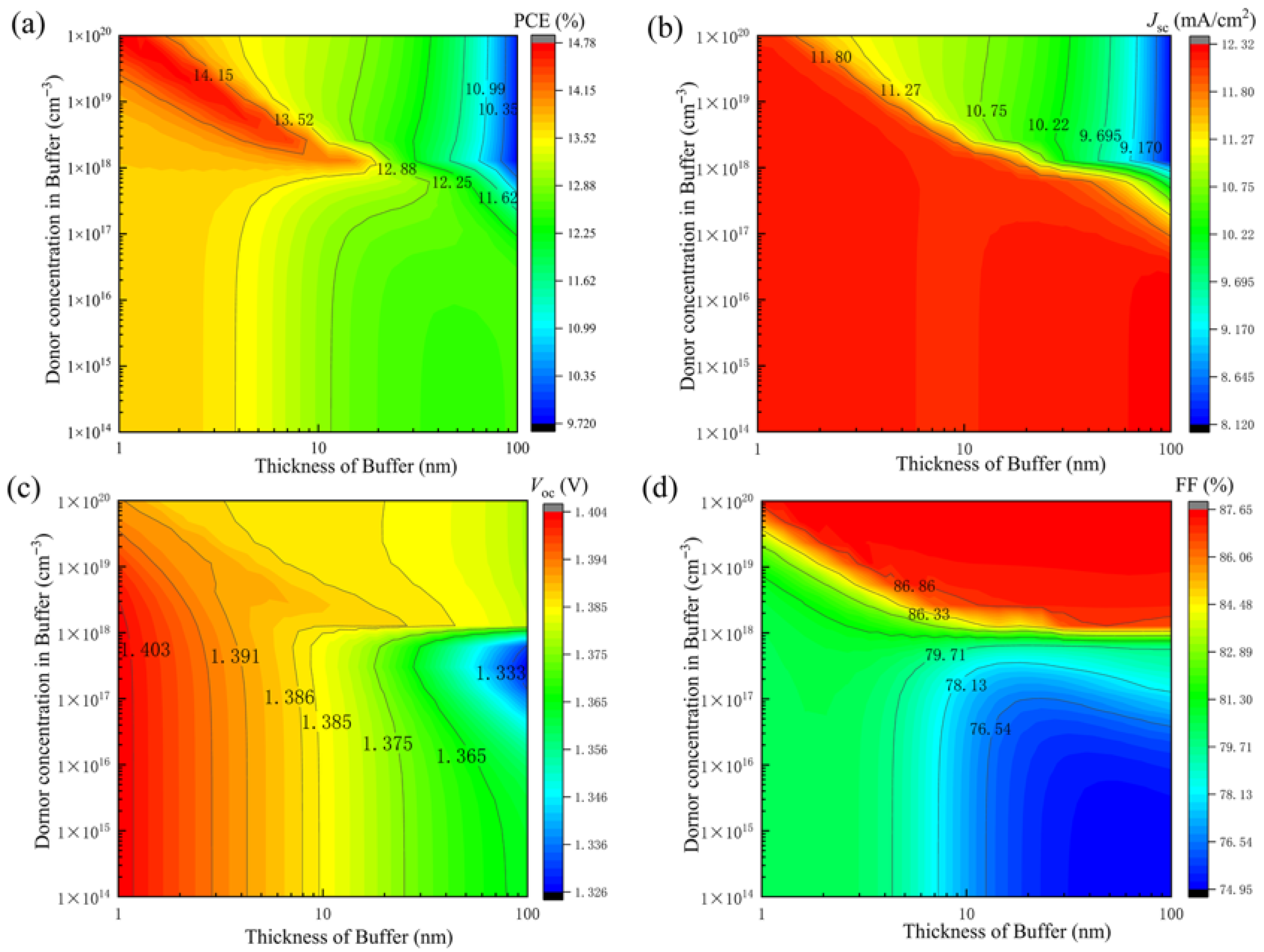 Figure 5. The impact of the buffer layer doping concentration and thickness on various parameters of the Cu2O solar cells: (a) PCE, (b) Jsc, (c) Voc, and (d) FF (the other parameters required for simulation were as follows: ETL: 80 nm, 1 × 1020 cm−3, Eg: 3.5 eV, χ: 3.9 eV. Cu2O: 10 μm, 1 × 1015 cm−3, Eg: 2 eV, χ: 3.2 eV. Buffer: Eg: 2 eV, χ: 3.5 eV. HTL: 200 nm, 1 × 1020 cm−3, Eg: 2 eV, χ: 3.2 eV).