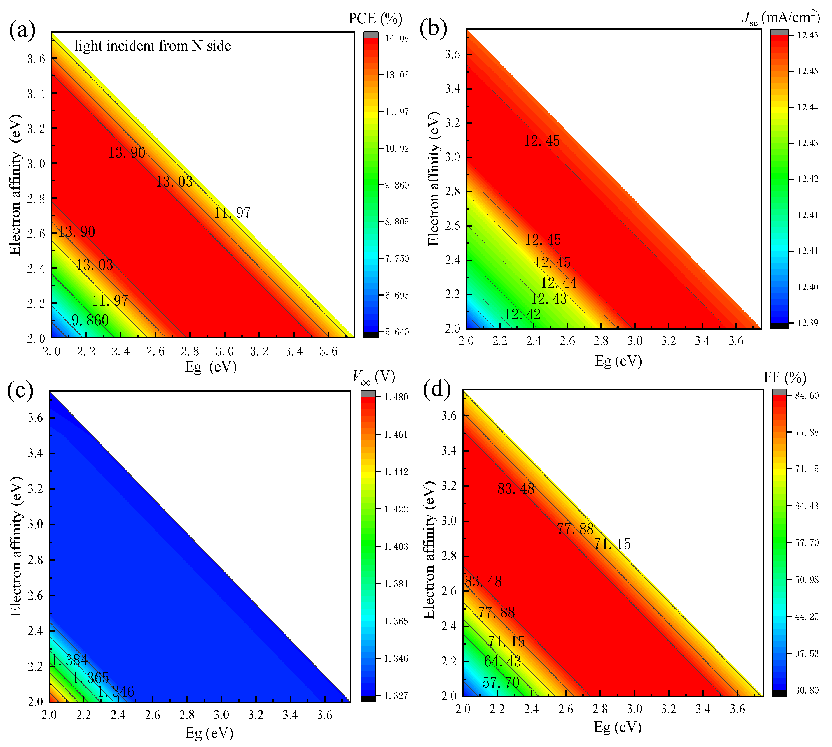 Figure 6. Impact of changing the band gap and electron affinity of the HTL layer on the performance of the Cu2O heterojunction solar cell: (a) PCE, (b) Jsc, (c) Voc, and (d) FF (the other parameters required for simulation were as follows: ETL: 80 nm, 1 × 1020 cm−3, Eg: 3.5 eV, χ: 3.9 eV. Cu2O: 10 μm, 1 × 1015 cm−3, Eg: 2 eV, χ: 3.2 eV. Buffer: 8 nm, 1 × 1019 cm−3, Eg: 2 eV, χ: 3.5 eV. HTL: 200 nm, 1 × 1020 cm−3).