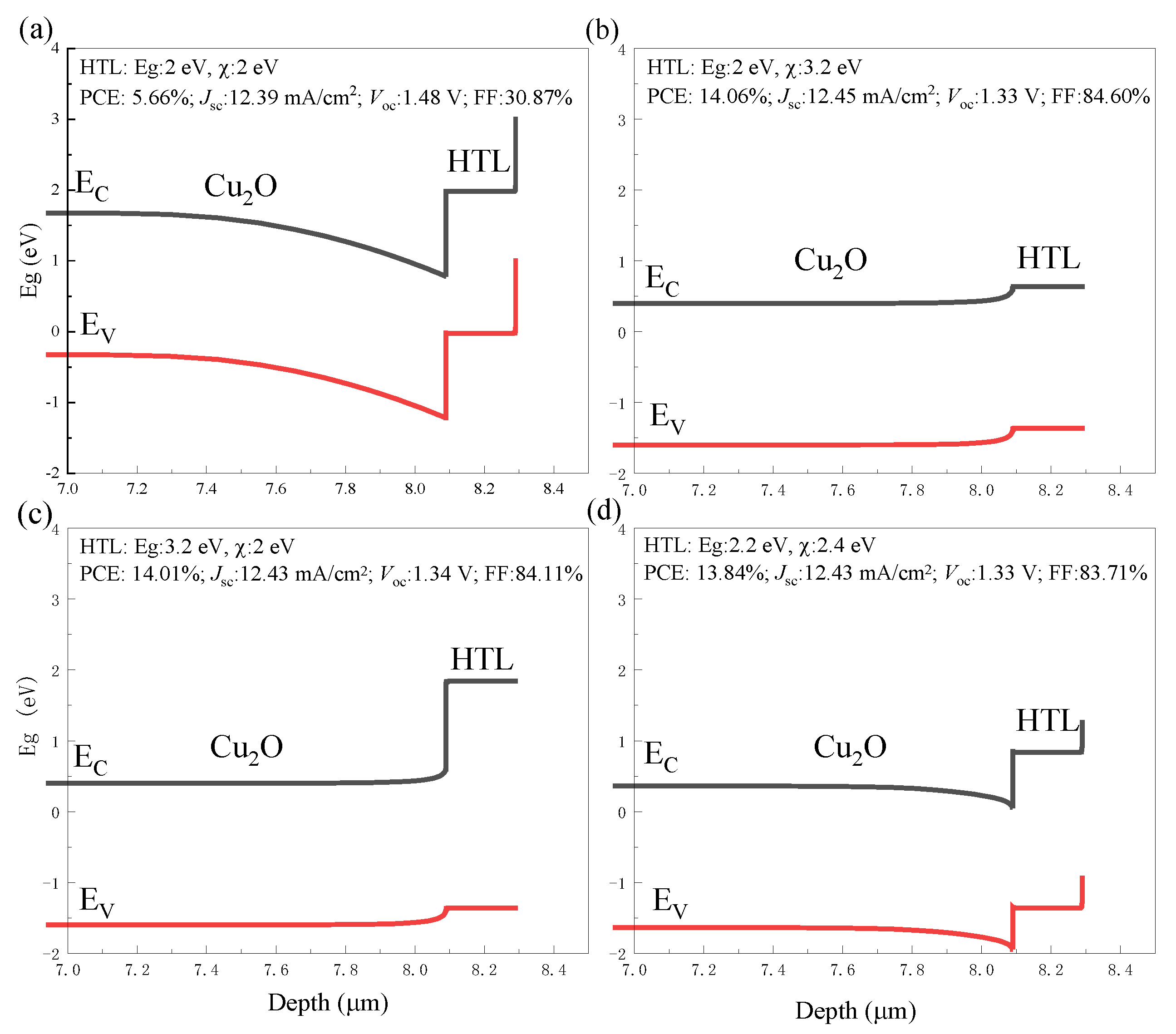 Figure 7. Energy band diagrams at the Cu2O/HTL interface for different values of band gap and electron affinity in the HTL layer. (a) Band diagram with Cu2O absorber (Eg: 2 eV, χ: 3.2 eV) and HTL (Eg: 2 eV, χ: 2 eV). (b) Band diagram with Cu2O absorber (Eg: 2 eV, χ: 3.2 eV) and HTL (Eg: 2 eV, χ: 3.2 eV). (c) Band diagram with Cu2O absorber (Eg: 2 eV, χ: 3.2 eV) and HTL (Eg: 3.2 eV, χ: 2 eV). (d) Band diagram with Cu2O absorber (Eg: 2 eV, χ: 3.2 eV) and HTL (Eg: 2.2 eV, χ: 2.4 eV) (the other parameters required for simulation were as follows: ETL: 80 nm, 1 × 1020 cm−3, Eg: 3.5 eV, χ: 3.9 eV. Cu2O: 10 μm, 1 × 1015 cm−3, Eg: 2 eV, χ: 3.2 eV. Buffer: 8 nm, 1 × 1019 cm−3, Eg: 2 eV, χ: 3.5 eV. HTL: 200 nm, 1 × 1020 cm−3).