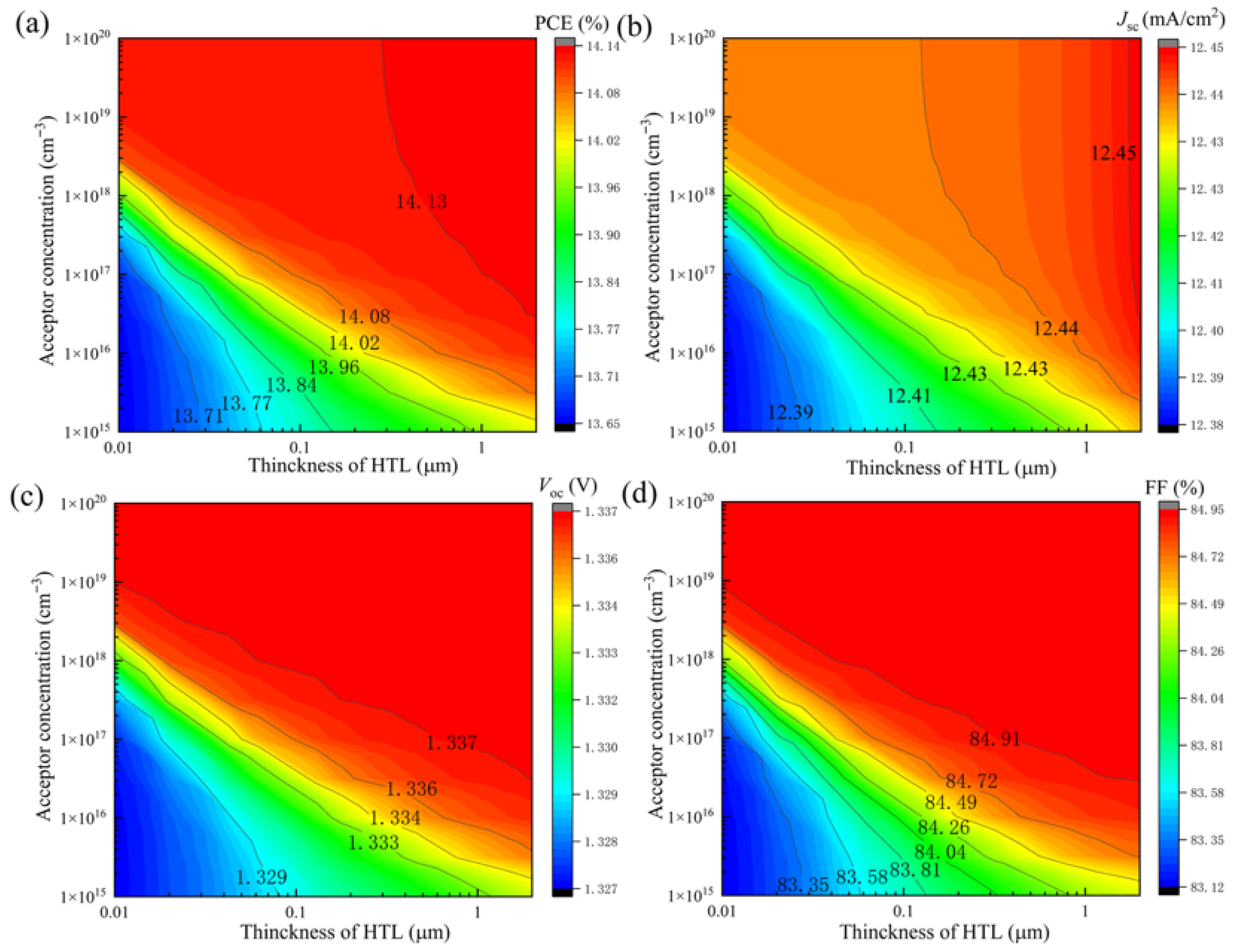 Figure 8. Impact of doping concentration and film thickness of the HTL layer on the performance of the Cu2O heterojunction solar cell: (a) PCE, (b) Jsc, (c) Voc, and (d) FF (the other parameters required for the simulation were as follows: ETL: 80 nm, 1 × 1020 cm−3, Eg: 3.5 eV, χ: 3.9 eV. Cu2O: 8 μm, 1 × 1015 cm−3, Eg: 2 eV, χ: 3.2 eV. Buffer: 8 nm, 1 × 1019 cm−3, Eg: 2 eV, χ: 3.5 eV, HTL: Eg: 2 eV, χ: 3.2 eV).