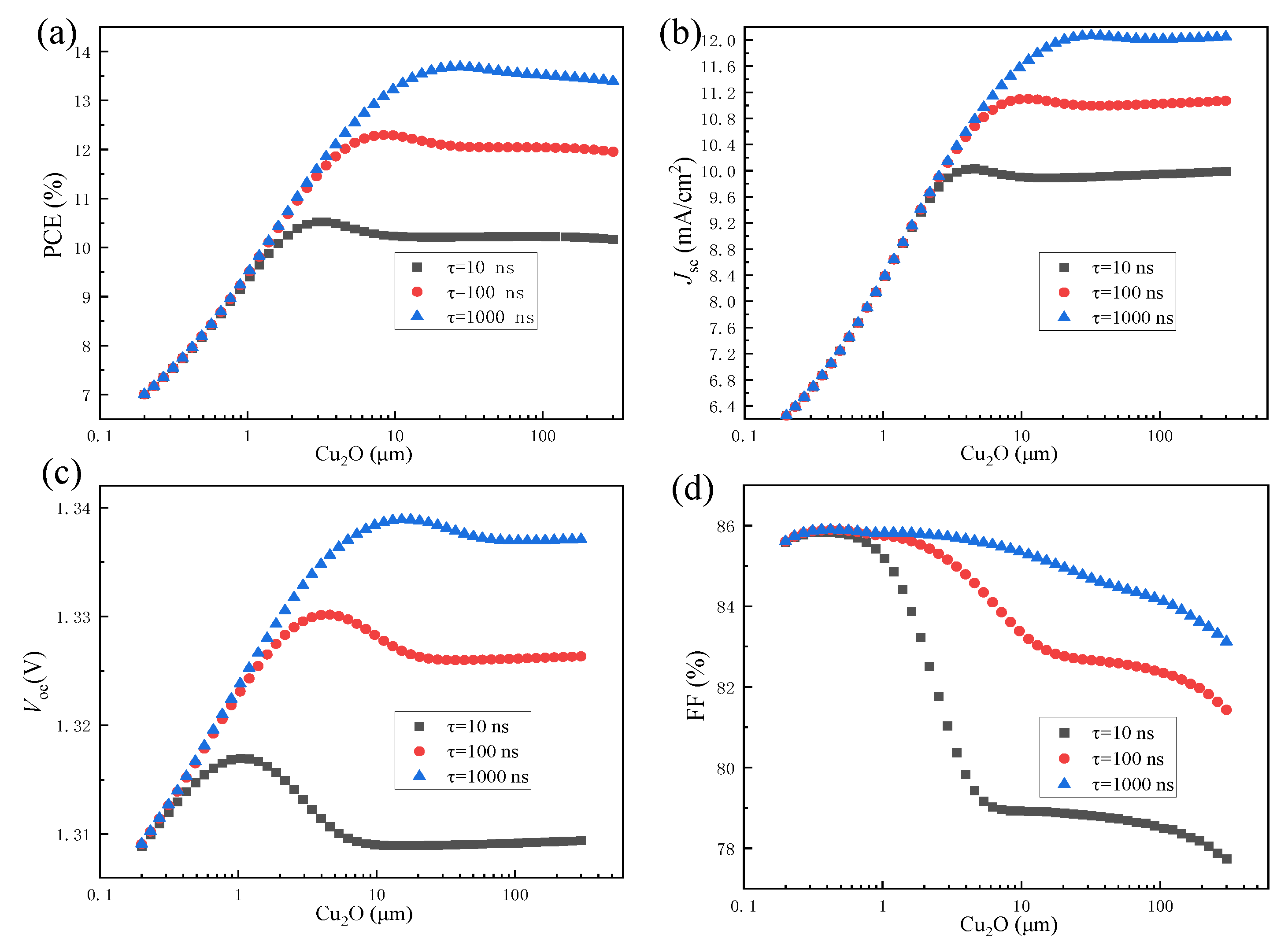 Figure 9. The influence of carrier lifetime and Cu2O layer thickness on the performance parameters of the Cu2O heterojunction solar cell: (a) PCE, (b) Jsc, (c) Voc, and (d) FF (the other parameters required for simulation were as follows: ETL: 80 nm, 1 × 1020 cm−3, Eg: 3.5 eV, χ: 3.9 eV. Cu2O: 1 × 1015 cm−3, Eg: 2 eV, χ: 3.2 eV. Buffer: 8 nm, 1 × 1019 cm−3, Eg: 2 eV, χ: 3.5 eV. HTL: 100 nm, 1 × 1020 cm−3, Eg: 2 eV, χ: 3.2 eV).