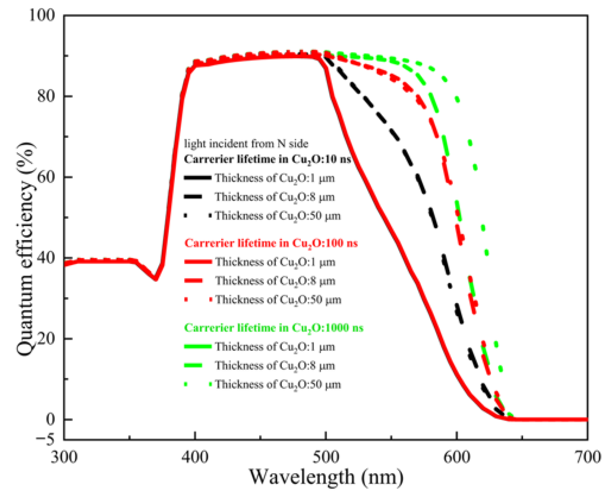 Figure 10. The influence of carrier lifetime and Cu2O layer thickness on quantum efficiency (the other parameters required for simulation were as follows: ETL: 80 nm, 1 × 1020 cm−3, Eg: 3.5 eV, χ: 3.9 eV. Cu2O: 1 × 1015 cm−3, Eg: 2 eV, χ: 3.2 eV. Buffer: 8 nm, 1 × 1019 cm−3, Eg: 2 eV, χ: 3.5 eV. HTL: 100 nm, 1 × 1020 cm−3, Eg: 2 eV, χ: 3.2 eV).