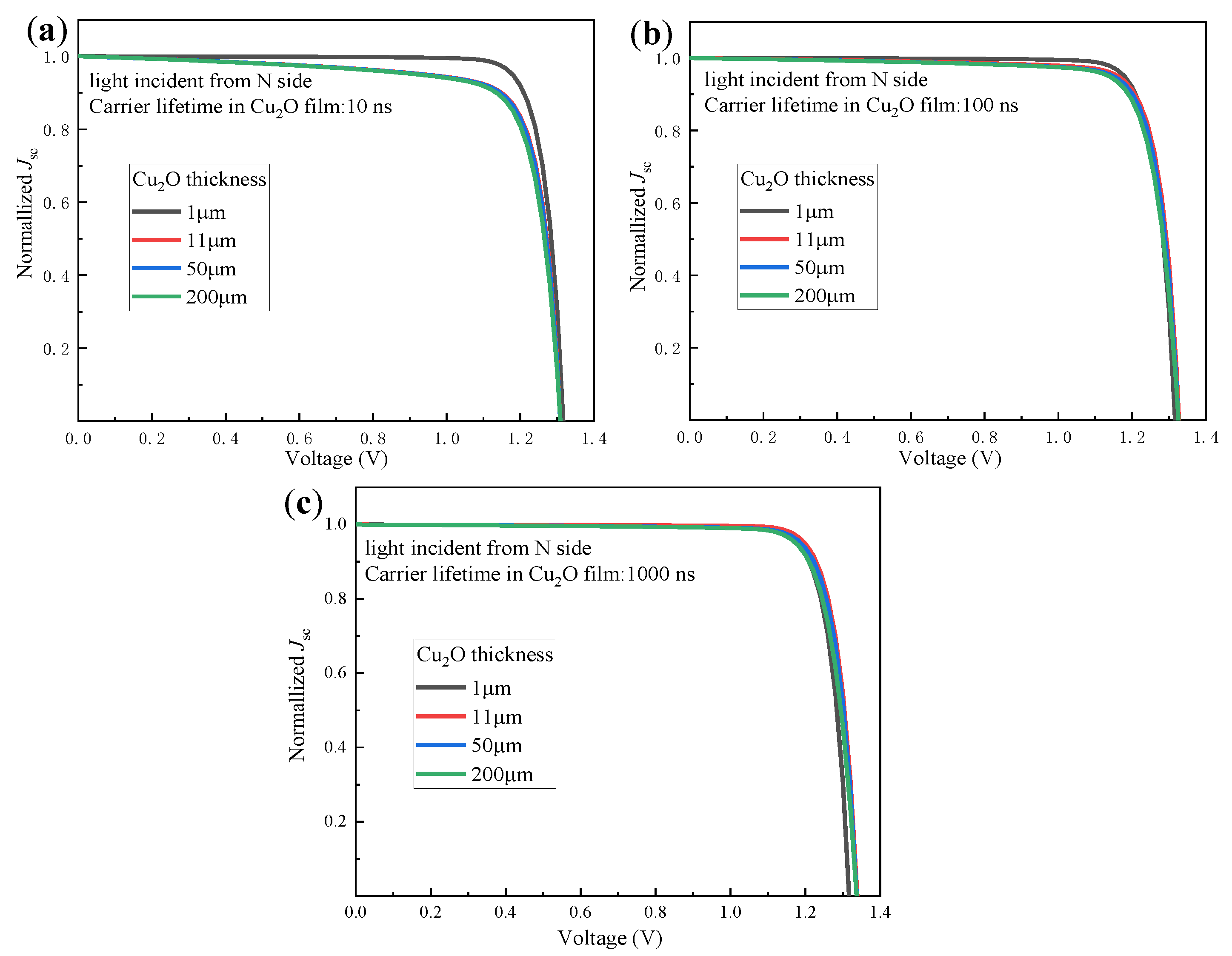 Figure 11. I–V curves for the Cu2O layers with varying minority carrier lifetimes and thicknesses: (a) τ = 10 ns, (b) τ = 100 ns, and (c) τ = 1000 ns (the other parameters required for simulation were as follows: ETL: 80 nm, 1 × 1020 cm−3, Eg: 3.5 eV, χ: 3.9 eV. Cu2O: 8 μm, 1 × 1015 cm−3, Eg: 2 eV, χ: 3.2 eV. Buffer: 8 nm, 1 × 1019 cm−3, Eg: 2 eV, χ: 3.5 eV. HTL: 100 nm, 1 × 1020 cm−3, Eg: 2 eV, χ: 3.2 eV).