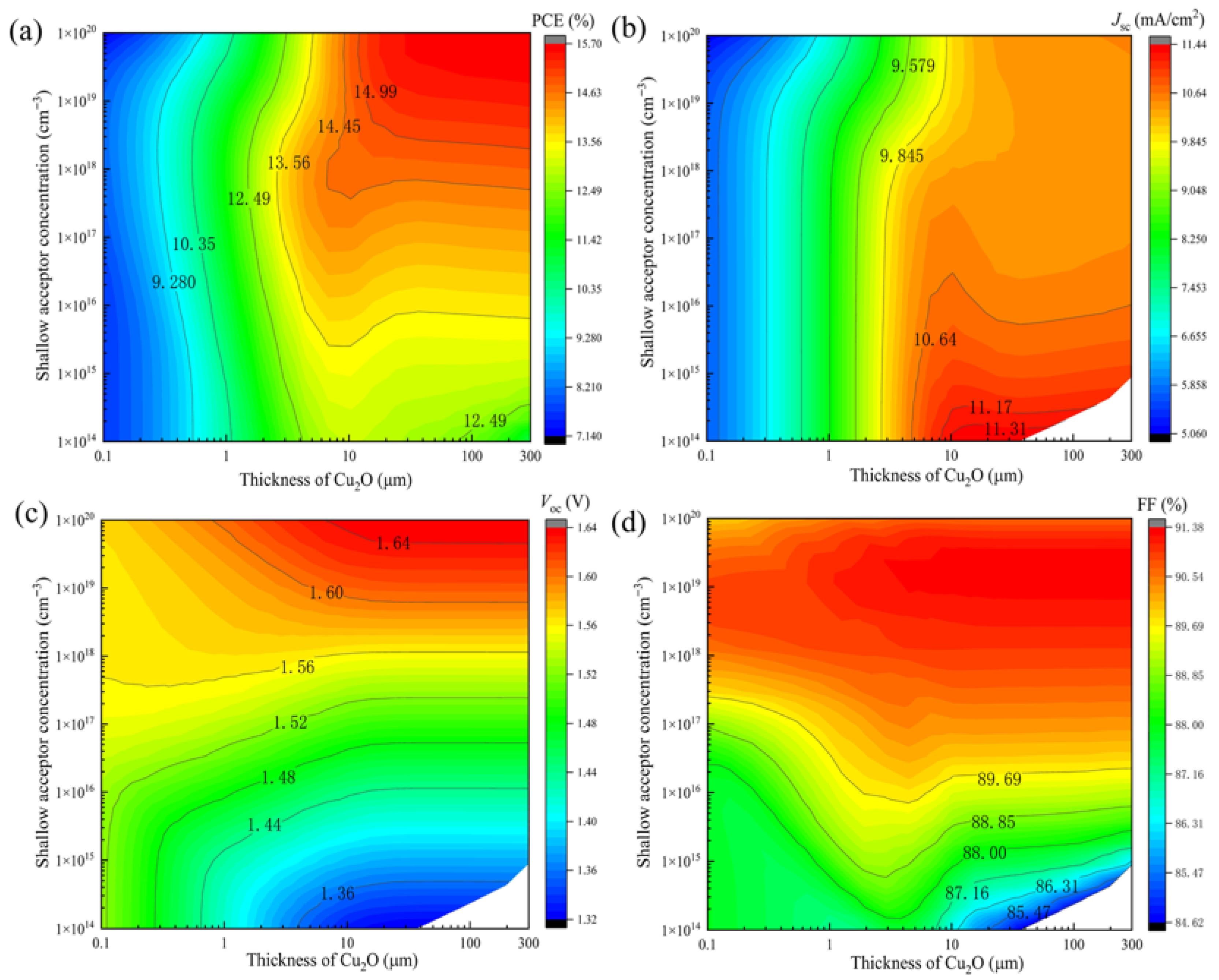 Figure 12. The influence of Cu2O layer doping concentration and thickness on the performance of the Cu2O solar cells: (a) PCE, (b) Jsc, (c) Voc, and (d) FF (the other parameters required for simulation were as follows: ETL: 80 nm, 1 × 1020 cm−3, Eg: 3.5 eV, χ: 3.9 eV. Cu2O: Eg: 2 eV, χ: 3.2 eV. Buffer: 8 nm, 1 × 1019 cm−3, Eg: 2 eV, χ: 3.5 eV. HTL: 100 nm, 1 × 1020 cm−3, Eg: 2 eV, χ: 3.2 eV).