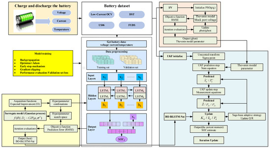 This cost function exhibits strong nonlinearity and involves high-dimensional unknown parameters. To prevent the solution process from converging to local minima, this study employs the PSO algorithm for parameter identification, as detailed in Section 4. Following the acquisition of equivalent circuit model parameters, SOC estimation is equivalent to a prediction problem. While such problems can be addressed using Kalman filter variants or LSTM networks, Kalman-type algorithms demonstrate high sensitivity to model inaccuracies, and LSTM suffers from the absence of physics-based constraints. Consequently, this work proposes a hybrid framework integrating BiLSTM with UKF. BiLSTM compensates for UKF’s model uncertainties, while BO and Sage–Husa adaptive filtering jointly regulate the hyperparameters of the BiLSTM network and the noise statistics of the UKF algorithm.