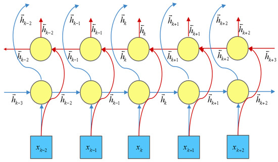Here, NE(∙) denotes the LSTM cell’s update computation process generating outputs based on timestep inputs and the previous hidden state, with detailed equations provided in (8)–(11). The terms and represent forward-updated and backward-updated hidden states, respectively. ⊕ is the vector concatenation operator. The fused hidden state hkl∈R2Cunits, where Cunits denotes the dimensionality of a single LSTM layer’s hidden state (the number of hidden layer units). By integrating outputs from both directional hidden layers, the model captures richer informative features, significantly enhancing its learning capacity and robustness.
