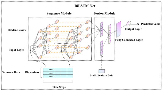 This paper proposes a dual-input BiLSTM architecture comprising two core modules: sequential feature learning and feature fusion, as depicted in Figure 5. In the sequential feature learning module, the sequence processing branch receives time-series input data. Specifically, sequential battery data Dseq = [d1, d2, …, dT] where dk = [Uk, Ik, Tempk]T. Through multiple cascaded BiLSTM layers, intrinsic temporal dependencies are extracted. For the initial L-1 layers, outputs preserve complete sequence information as Hl = [h1l, h2l, …, hTl]. The final BiLSTM layer outputs only the last timestep’s hidden state hseqL to capture global temporal evolution characteristics. In the feature fusion module, the static feature branch receives non-sequential inputs at the current timestep. These features are encoded via a fully connected layer to produce hs, which is projected into a feature space dimensionally compatible with the sequence branch’s output. The static branch output is given by