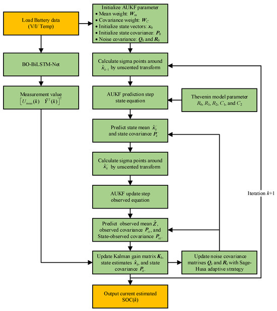 The final framework feeds the predicted battery SOC estimates from the BO-BiLSTM network into a physics-based AUKF module. The AUKF algorithm further optimizes the SOC estimates to enhance estimation accuracy.