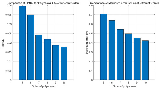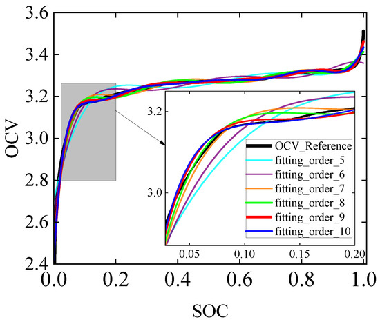 During low-rate charge–discharge testing, the battery’s polarization effects (ohmic resistance, concentration polarization) are minimal, and the measured voltage approaches a quasi-equilibrium state. In this experiment, charge–discharge testing was conducted at a constant current rate of C/20 (where C denotes the battery’s nominal capacity). This rate effectively suppresses polarization effects, thereby providing a reliable basis for establishing an accurate OCV-SOC relationship. Voltage data acquired at various temperatures are well-suited as a reference for establishing the OCV-SOC relationship. Based on discharge voltage curves at each temperature, polynomial fitting was applied to derive OCV-SOC curves. Fitting accuracy depends on polynomial order: while higher orders generally improve precision, excessively high orders may cause overfitting, which is manifested as terminal “oscillations” that compromise practical applicability. Conversely, insufficient orders result in underfitting, leading to unacceptable curve deviations. As shown in the fitting comparison and error evaluation results of polynomial functions of different orders in Figure 8 and Figure 9, the fitting accuracy generally demonstrates an upward trend as the order increases. The ninth-order polynomial significantly outperforms lower-order models, while its error level closely matches that of the tenth-order model. By ensuring precision, the ninth-order polynomial exhibits superior model stability and effectively mitigates the risk of overfitting, and has therefore been selected as the final choice.
