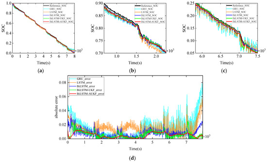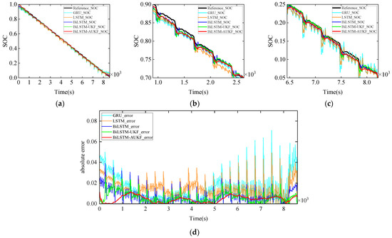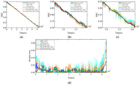 Comprehensive experimental evaluations confirm the superior estimation accuracy of the proposed BiLSTM-AUKF algorithm across diverse operating conditions compared to conventional methods such as GRU and LSTM. Under the dynamic stress test (DST) profile, for instance, the baseline GRU architecture yields an RMSE of 1.9514%, whereas the LSTM reduces this value to 1.6779%. The bidirectional LSTM structure demonstrates further improvement, achieving RMSE and MAE values of 0.94334% and 0.73297%, respectively, underscoring its enhanced capability in capturing temporal dependencies compared to unidirectional counterparts. Further refinement through the adaptive unscented Kalman filter culminates in the BiLSTM-AUKF hybrid model attaining RMSE and MAE values of 0.53123% and 0.44287%, corresponding to accuracy improvements of approximately 32.16% and 27.29% relative to the BiLSTM-UKF framework. These results substantiate that the synergistic integration of BiLSTM’s sophisticated feature extraction with AUKF’s robust filtering capacity produces a substantial enhancement in SOC estimation precision.