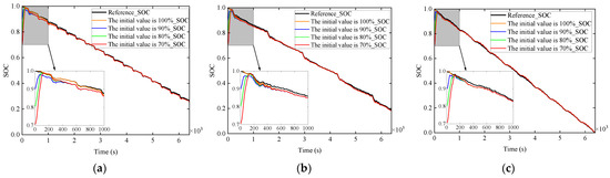 To further validate the robustness of the proposed BiLSTM-AUKF algorithm under inaccurate initial SOC conditions, experiments were conducted at 20 °C using the DST, FUDS, and US06 driving cycles with varied initial SOC settings. Notably, the experimental conditions remained consistent with those described in Section 7.3, with the only modification being the variation in initial SOC values. The true initial SOC was 100%, while the algorithm was initialized at 90%, 80%, and 70%, respectively. As shown in Figure 14, the BiLSTM-AUKF algorithm rapidly converges to the true SOC value despite initial inaccuracies, demonstrating exceptional robustness.