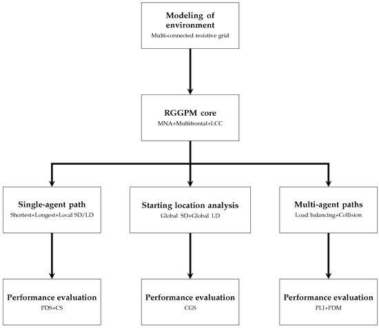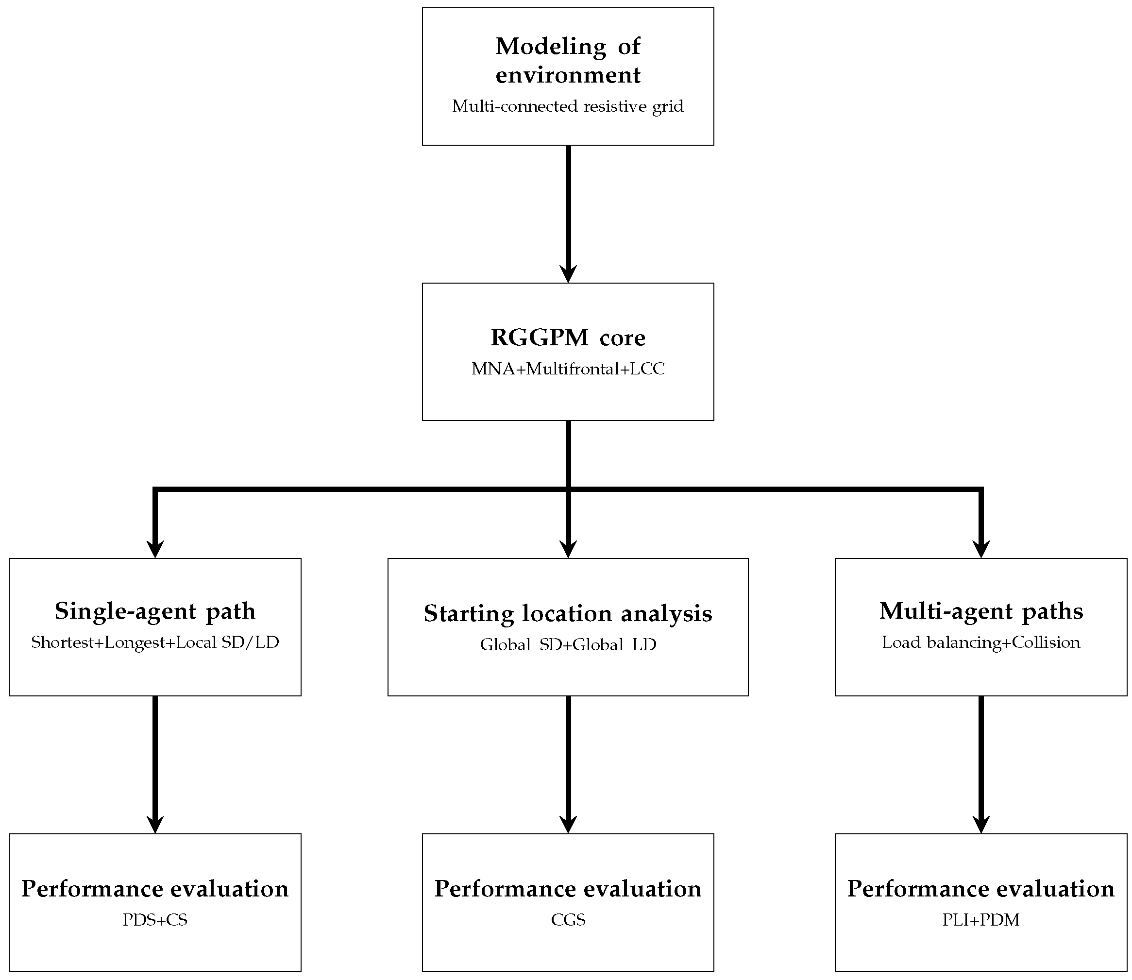 In this section, the strategies for path planning are described in depth. Figure 1 provides a structural overview of the intelligent system framework, depicting how its core components interconnect to address different logistical challenges through a unified physics-based approach. Initially, the core intelligent process is introduced. RGPPM provides a robust framework for optimizing logistics movements and leverages a resistive grid model to facilitate path planning in navigating complex scenarios, such as merchandise delivery in urban areas.