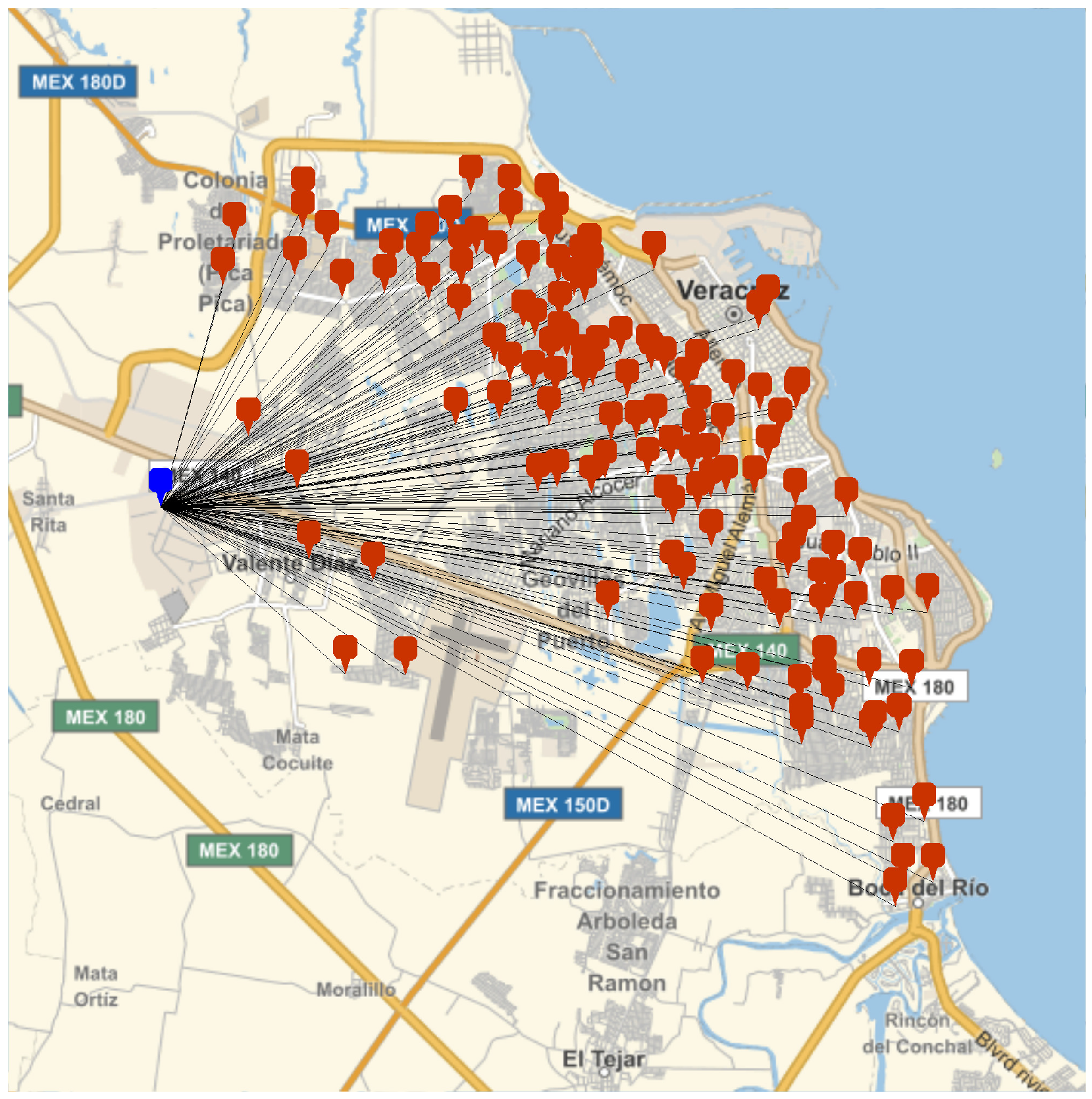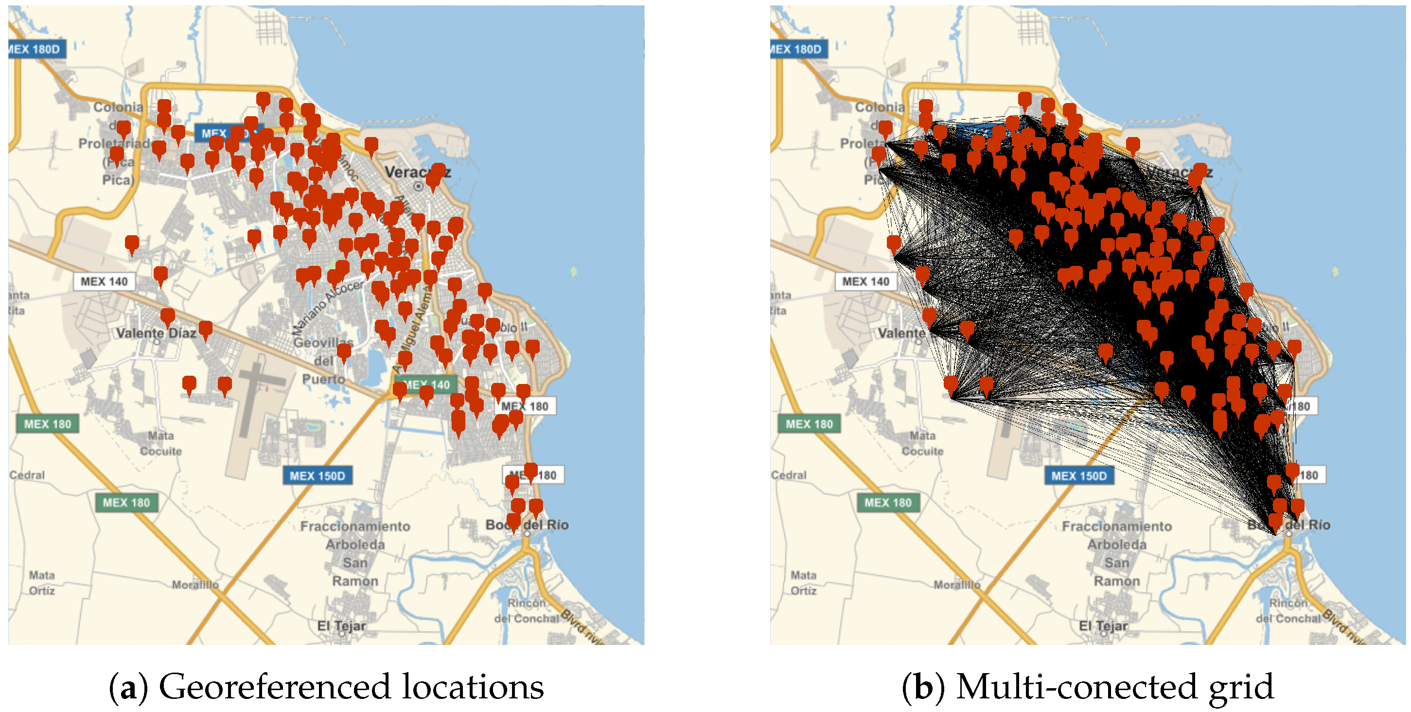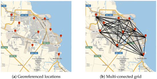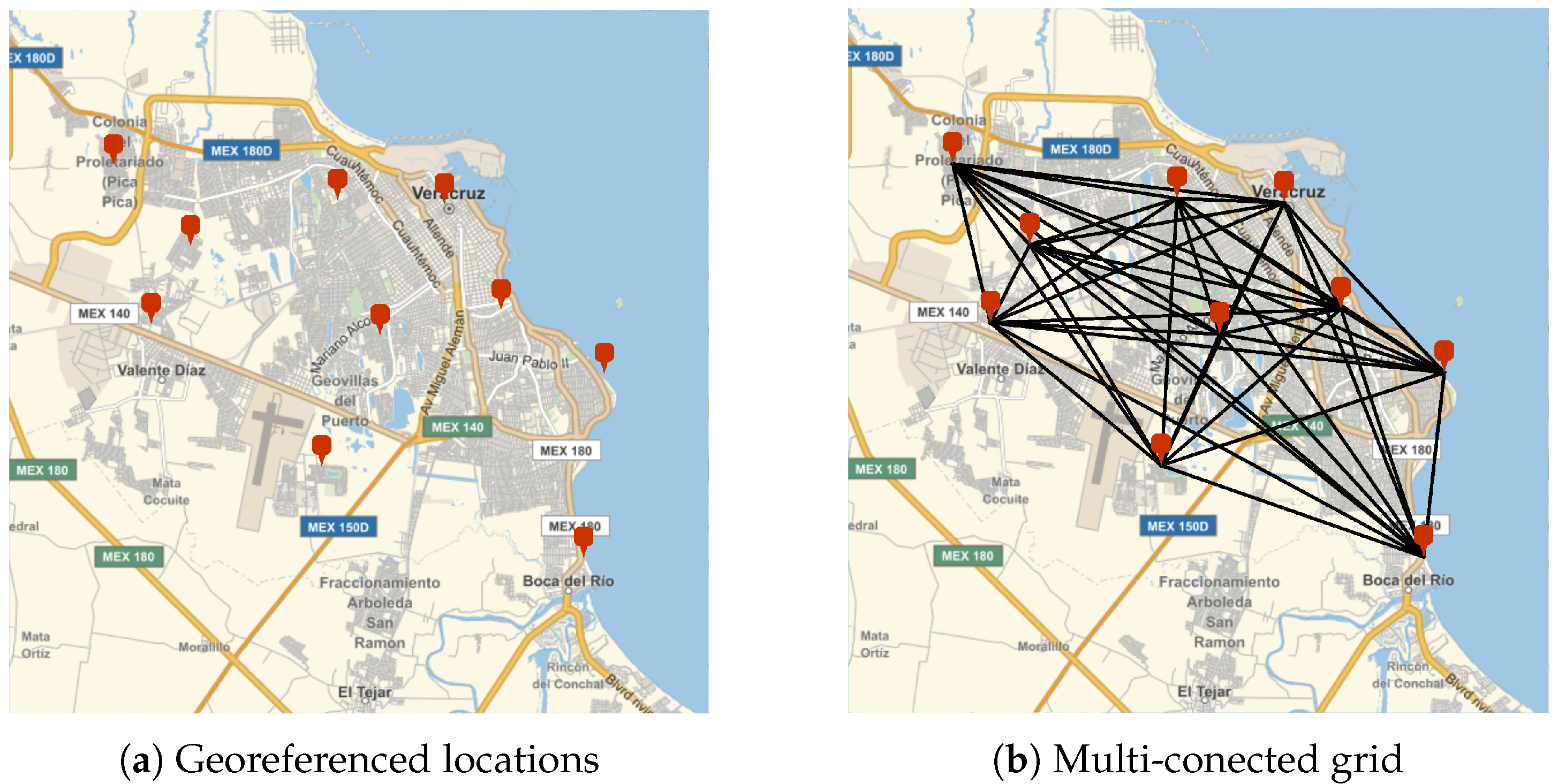 Firstly, it is necessary to identify and geolocate the delivery points for merchandise to generate a multi-connected grid, as shown in Figure 2. In Figure 2a, ten delivery points have been georeferenced within the Veracruz–Boca del Río metropolitan area. Based on this set of locations, it is possible to generate a grid that connects each point with all other available positions, as illustrated in Figure 2b.