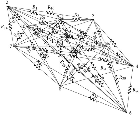 As shown in Figure 3, forty-five resistors have been incorporated into the grid. The resistance values of these elements are determined based on the distances between the merchandise delivery locations. For computing these distances, the Haversine formula is used, which estimates the distance between two points on the Earth’s surface. Table 1 shows the numerical values of the resistors (in ).