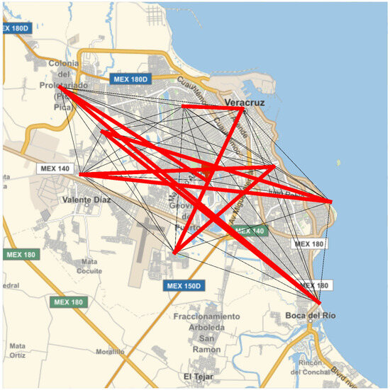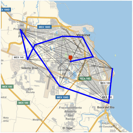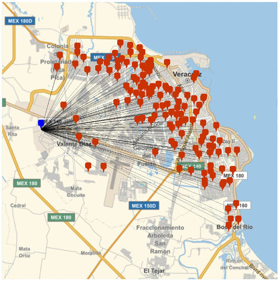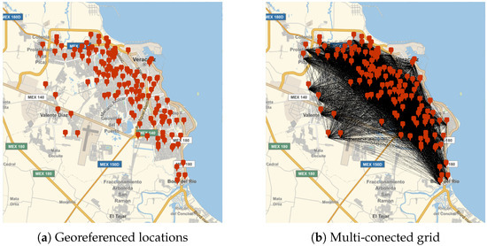 As shown in Figure 8, the georeferenced positions of elementary schools have been mapped in the Veracruz–Boca del Río metropolitan area. Additionally, a multi-connected grid was constructed based on these geospatial locations.