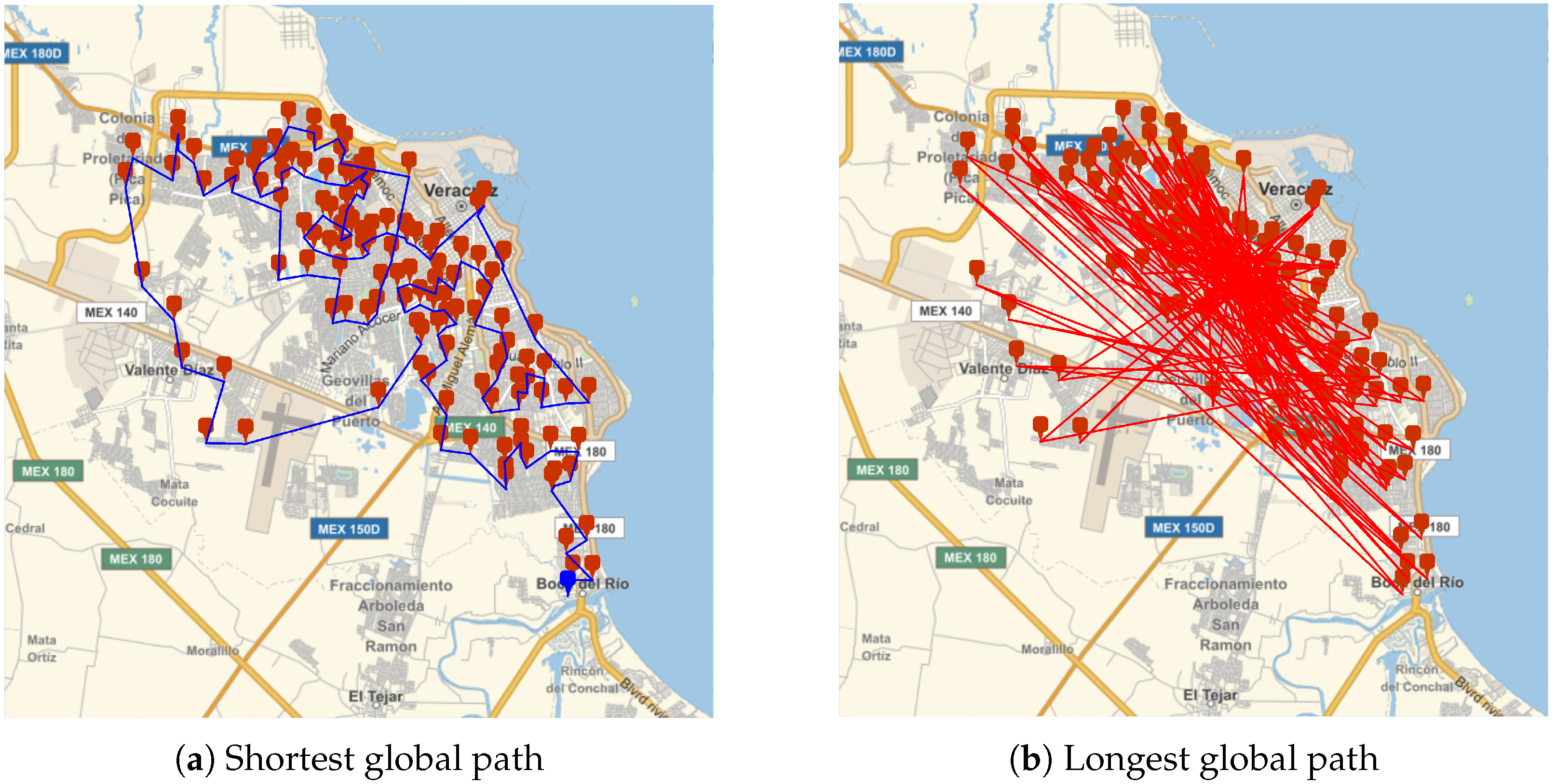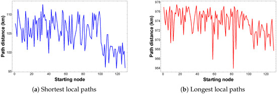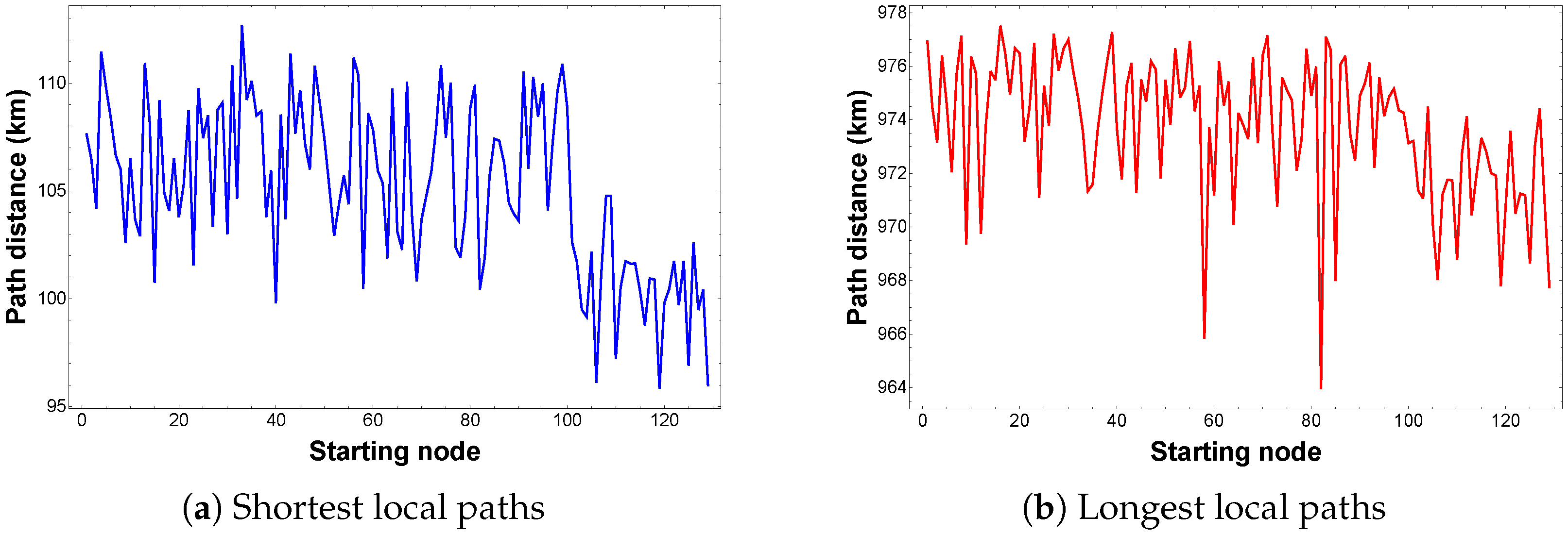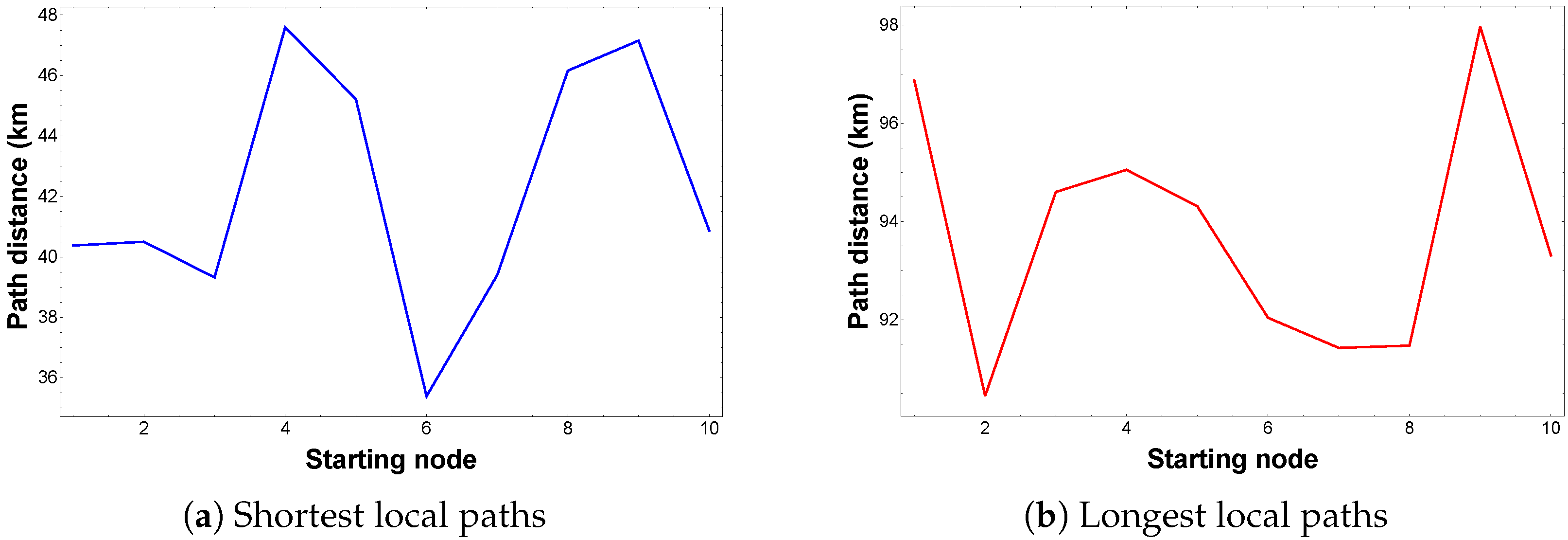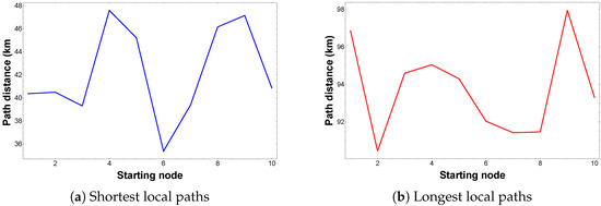 Figure 6 shows the evaluation of the lengths of the shortest and longest paths from different starting locations. As observed in Figure 6a, the shortest distance among the shortest local paths is obtained when starting at node 6, with a length of 35.39 km. Similarly, the longest distance among the longest local paths is reached when starting at node 9, with a length of 97.96 km, as shown in Figure 6b.