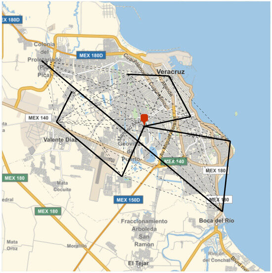 Based on the official logistics process described and the specific case of the 129 georeferenced locations of public elementary schools in the Veracruz–Boca del Rio area, it is possible to reconstruct the trajectory grid used for textbook collection, as shown in Figure 12.