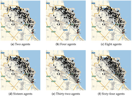 Finally, the multi-agent strategy has been carried out for delivering textbooks in the Veracruz–Boca del Río area. To accomplish this, the agents’ starting location was set to node 119, as it corresponds to the shortest path in the global network. Additionally, the number of agents was configured into teams of 2, 4, 8, 16, 32, and 64. As shown in Figure 11, the logistical trajectories for the different groupings of agents have been generated. For each configuration, the total path length was calculated and is presented in Table 9.