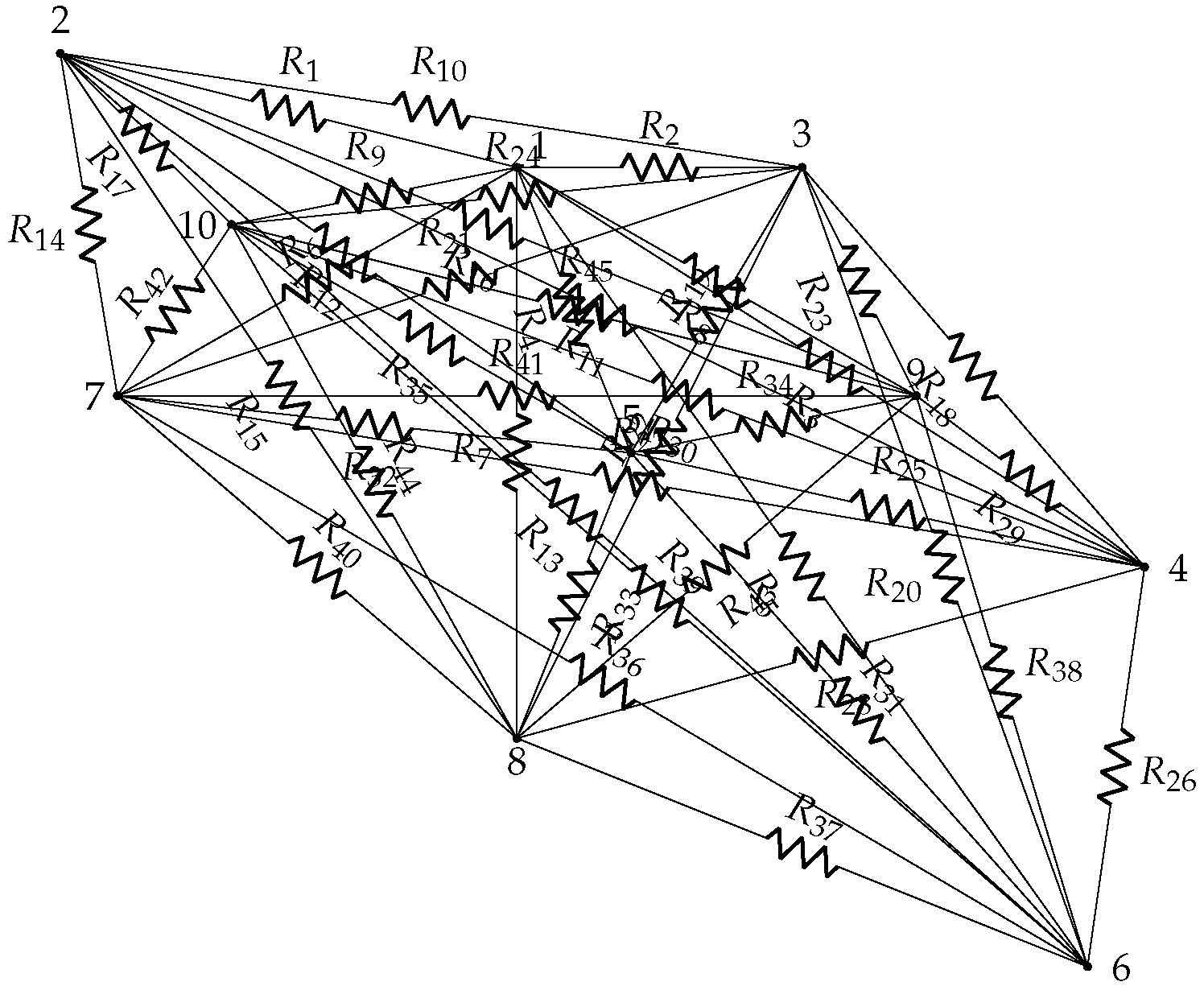 Figure 4 shows the shortest path for delivering merchandise in a single path starting from a single location. According to the results, the starting node is number five, which generates a connection tree composed of the blue-highlighted resistors R 34 , R 23 , R 2 , R 9 , R 42 , R 14 , R 15 , R 37 , R 26 and a path sequence 5 , 9 , 3 , 1 , 10 , 7 , 2 , 8 , 6 , 4 . The total length of this shortest path has been calculated around 45.22 km, as shown in Table 2.